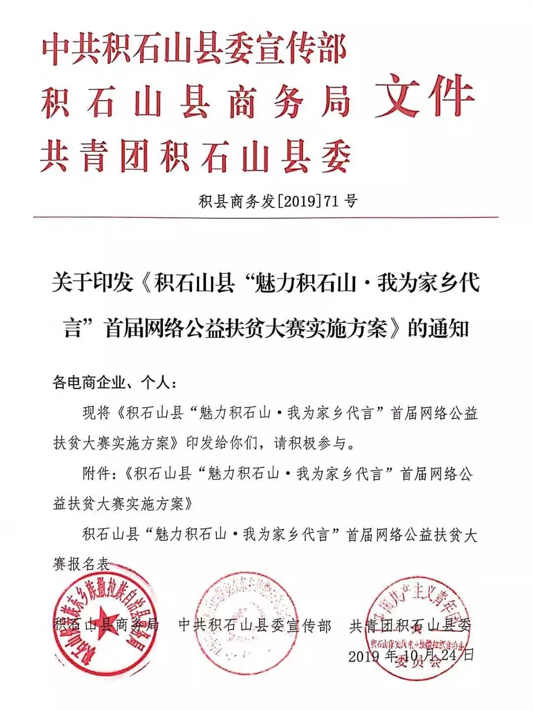 在“决战脱贫攻坚、决胜全面建成小康社会”的征程中,积石山县抢抓“农村电商”高速发展的历史机遇,锐意进取、苦干实干,朝着让积石山县成为经济发展、山川秀美、民族团结、社会和谐、人民幸福的美好家园阔步前进。为此县上将举办“魅力积石山·我为家乡代言”首届网络公益扶贫大赛,旨在通过互联网新平台促进贫困地区农产品消费,拓宽消费渠道,打破传统扶贫中的单方模式,通过直播带货和社群营销等方式,进一步搭建农产品产销对接桥梁,引导市民群众购买积石山当地的特色农产品,直接或间接帮助贫困户脱贫增收,提升积石山县“积石丰农”品牌市场影响力和竞争力。