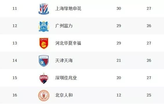 中超后六名积分情况,左边数字为球队积分,右边数字为已赛场次。