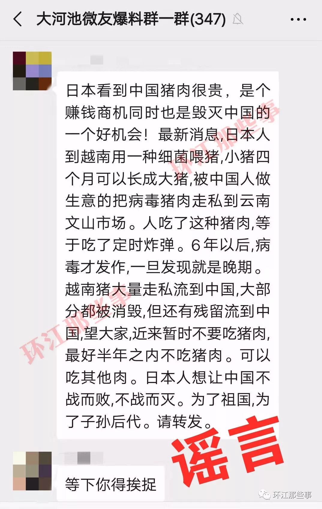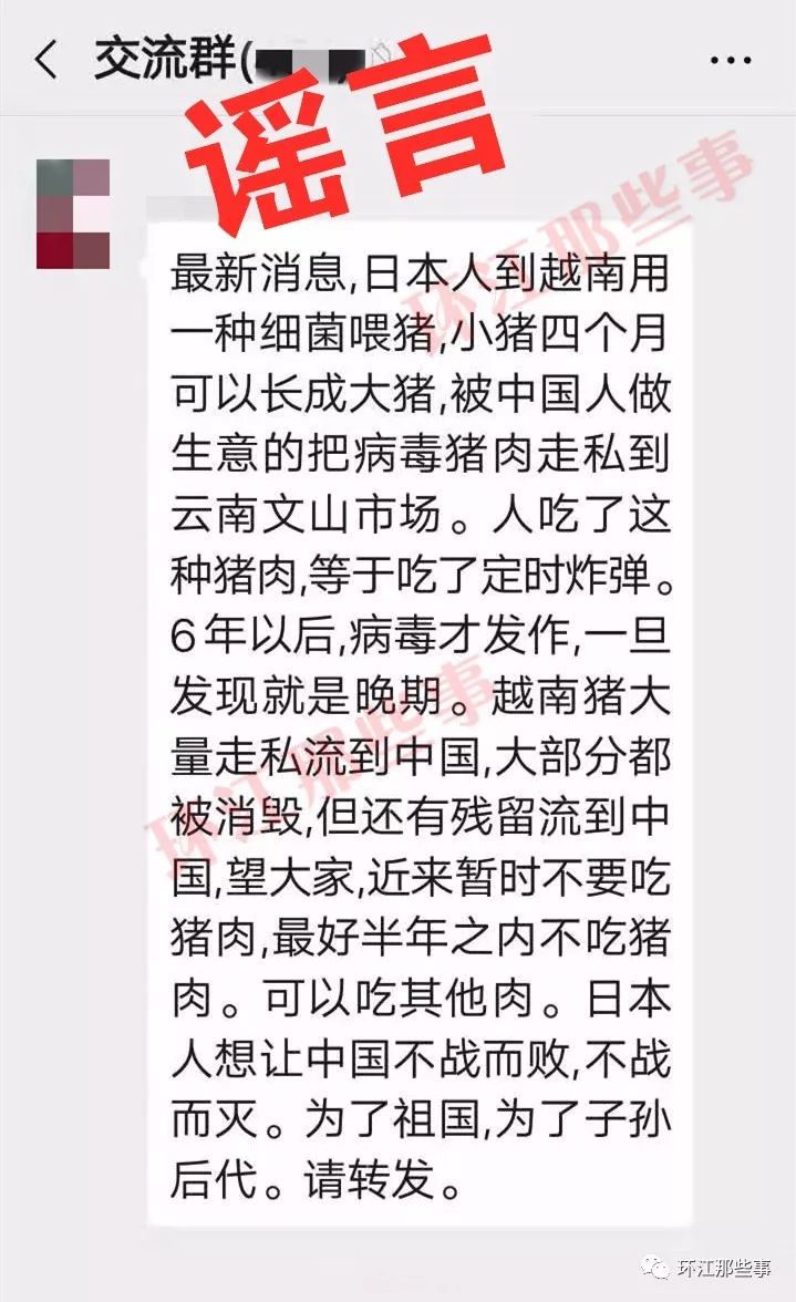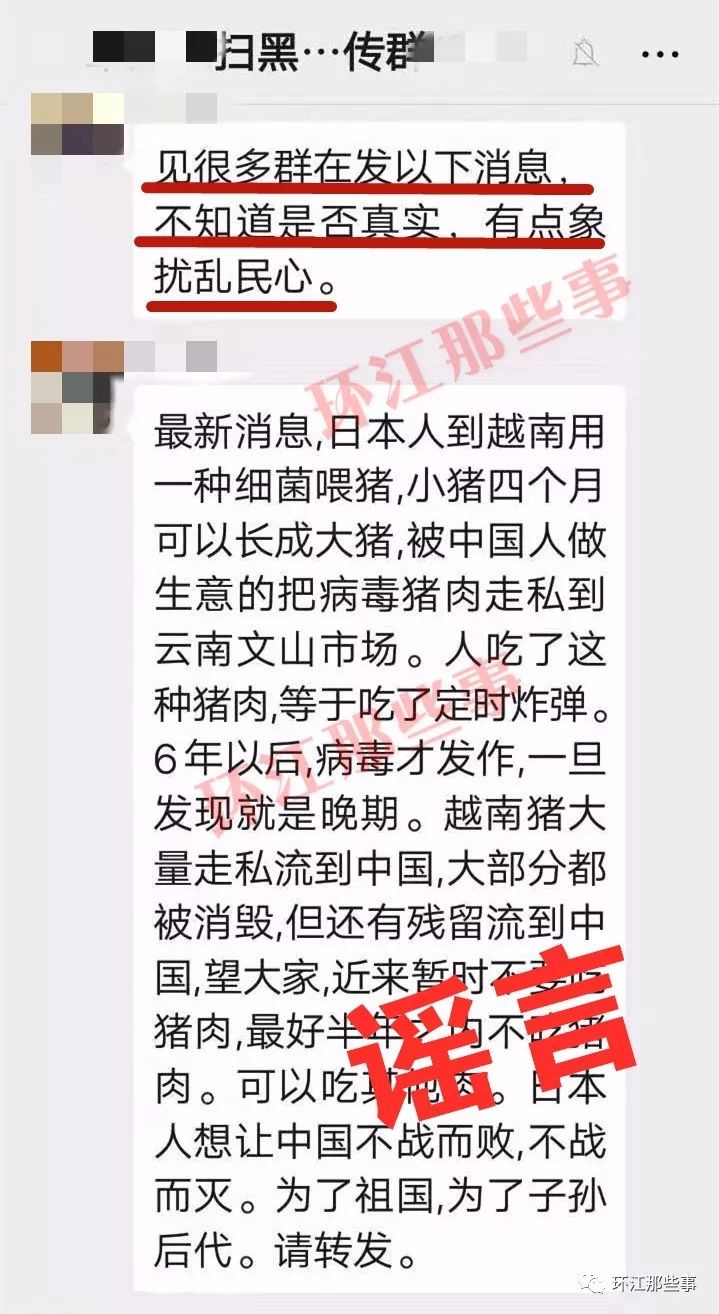 这几天,有很多微友向“环江那些事 小江”爆料称,在环江甚至河池有好多微信群见有人在转发这样一条信息“日本人在越南用细菌喂猪,小猪四个月长成后被走私到中国售卖,吃了等于定时炸弹......”