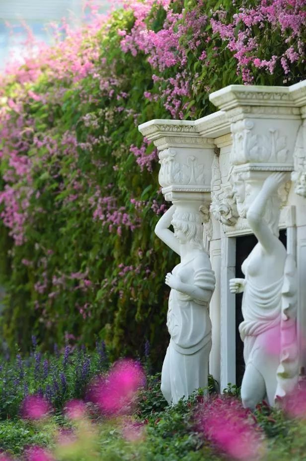 沿着屋顶生长的珊瑚藤把屋顶也染成了粉红色