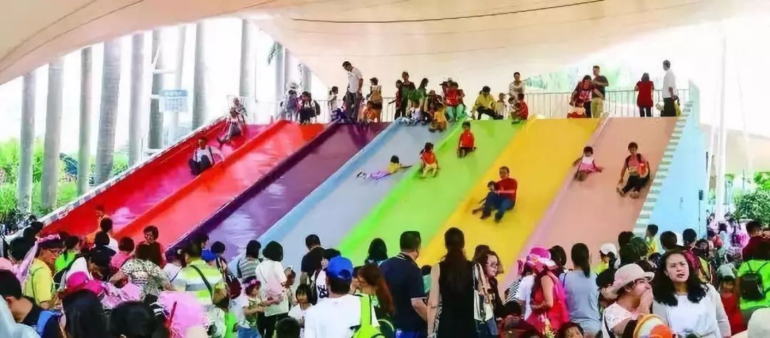 七道彩虹滑梯格外引人注目登上顶端 感受下滑乐趣