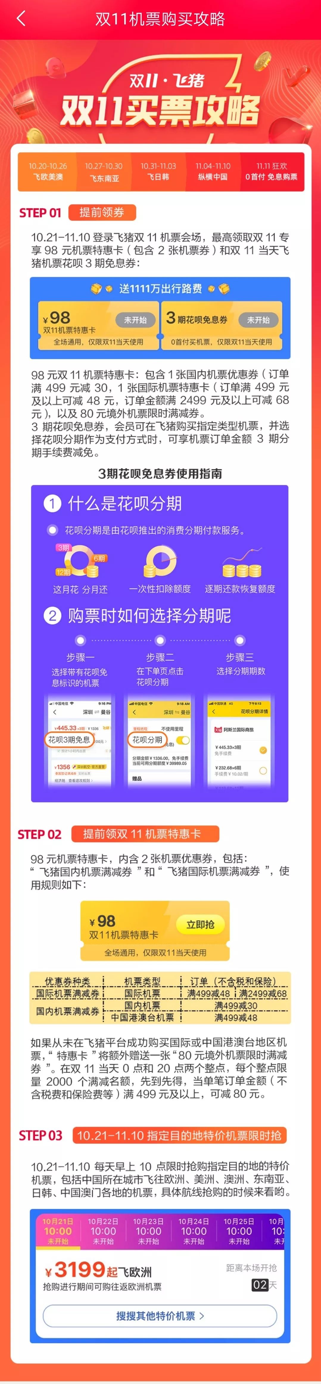 看起来,信息超级多的其实主要就是要记得提前领券还有记住双11机票专场的时间点10.27~10.30 东南亚专场11.04~11.10 纵横中国10.21~10.26 欧美澳专场10.31~11.03 日韩线专场11.11 零首付免息购票