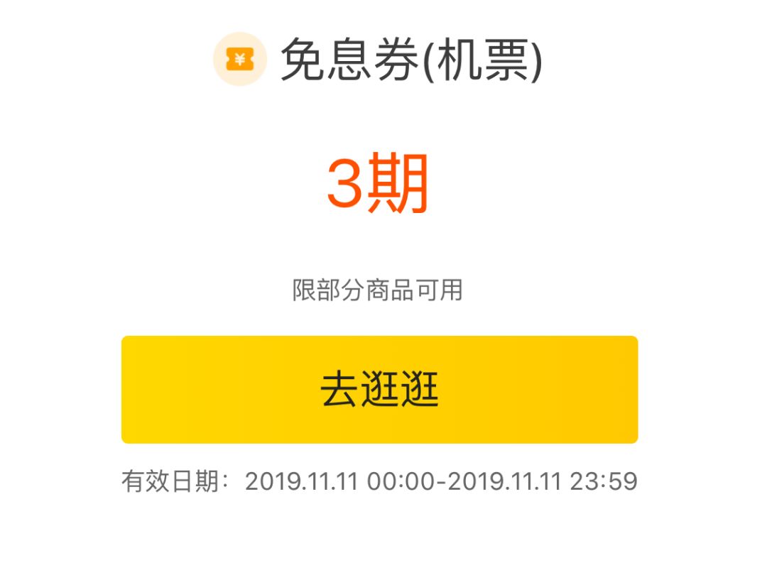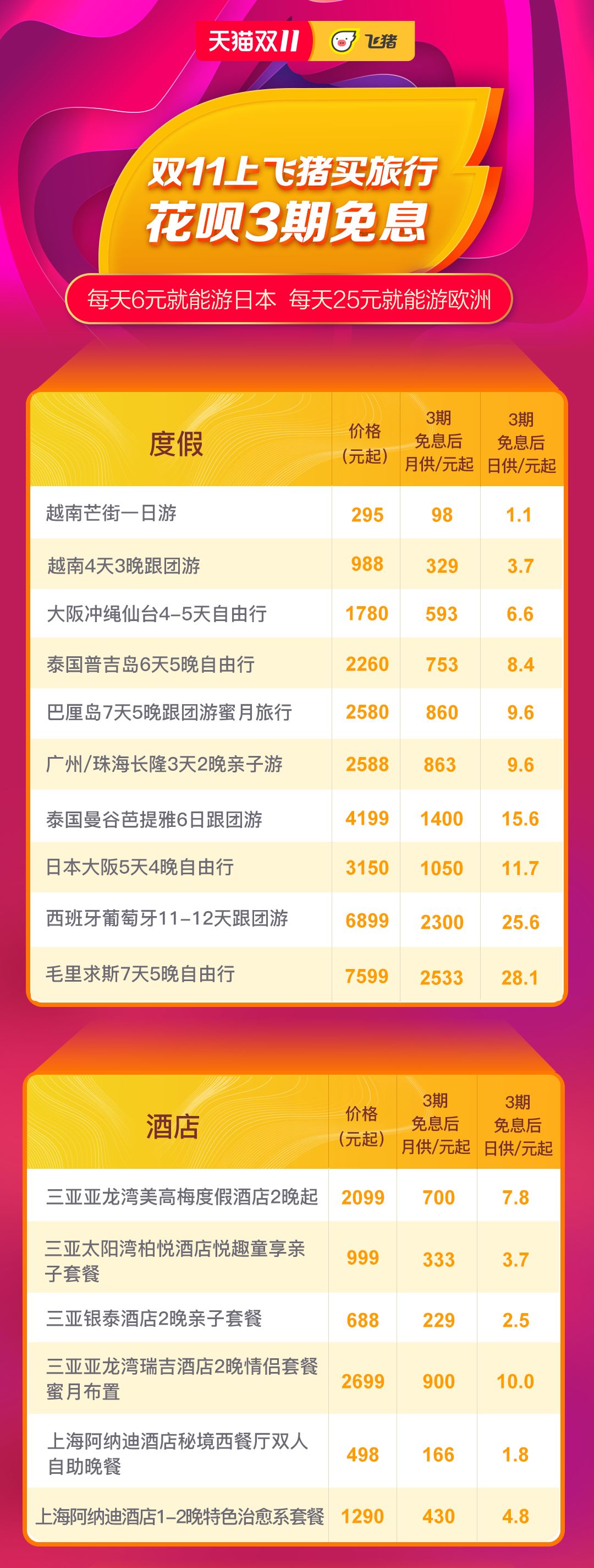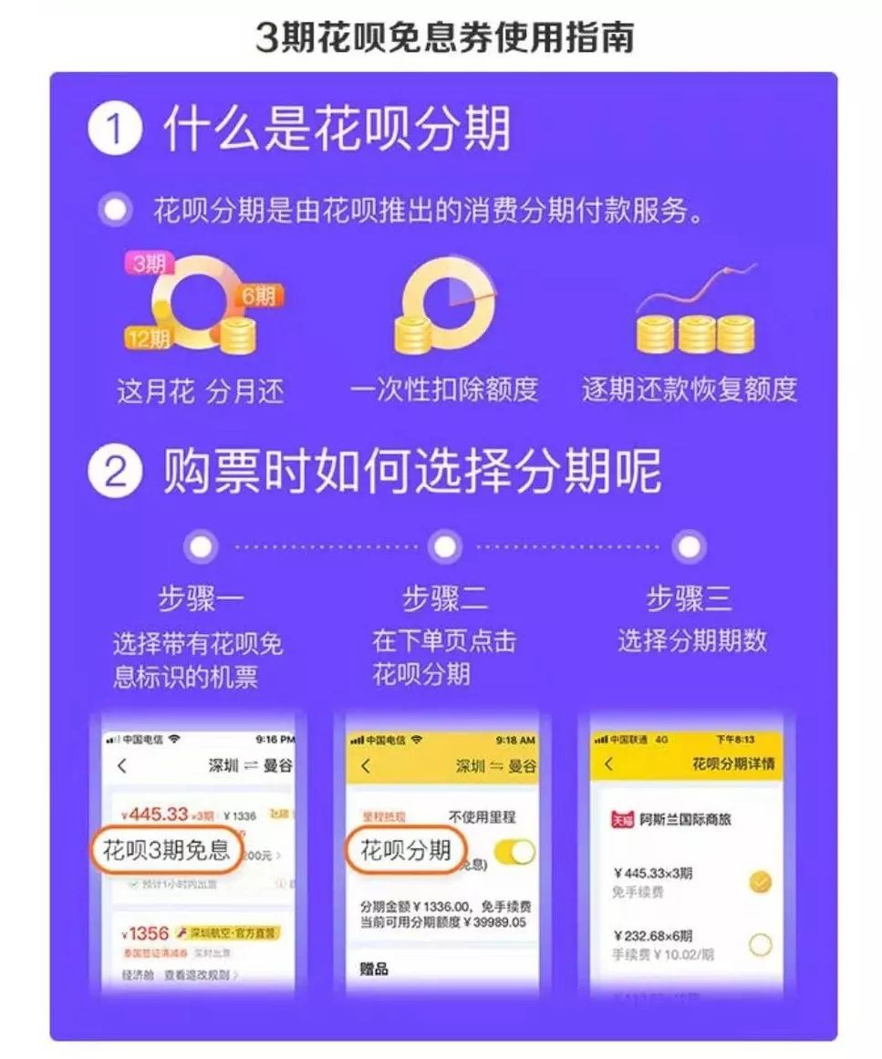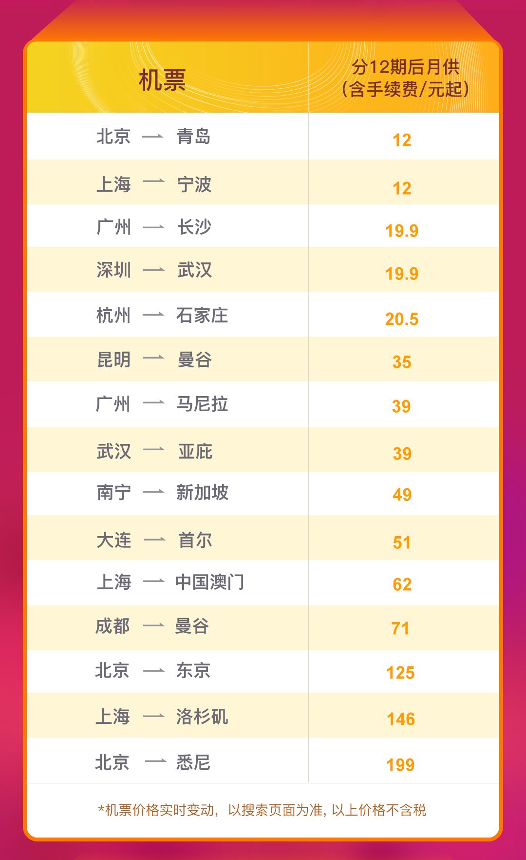 双11花呗分期买机票12元起全球FUN肆玩双11当天,带有“飞猪自营”标识的境内境外航线全部支持花呗3期免息记得提前在会场领取3期免息券