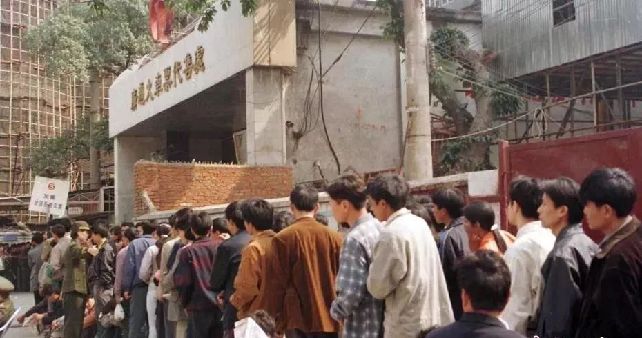 火车售票处,归心似箭的人们排队购票。春运刚一开始,这颗心就静不下来了。图为1999年2月7日,广东春运已进入高峰,火车站送走旅客近十万人。中新社发