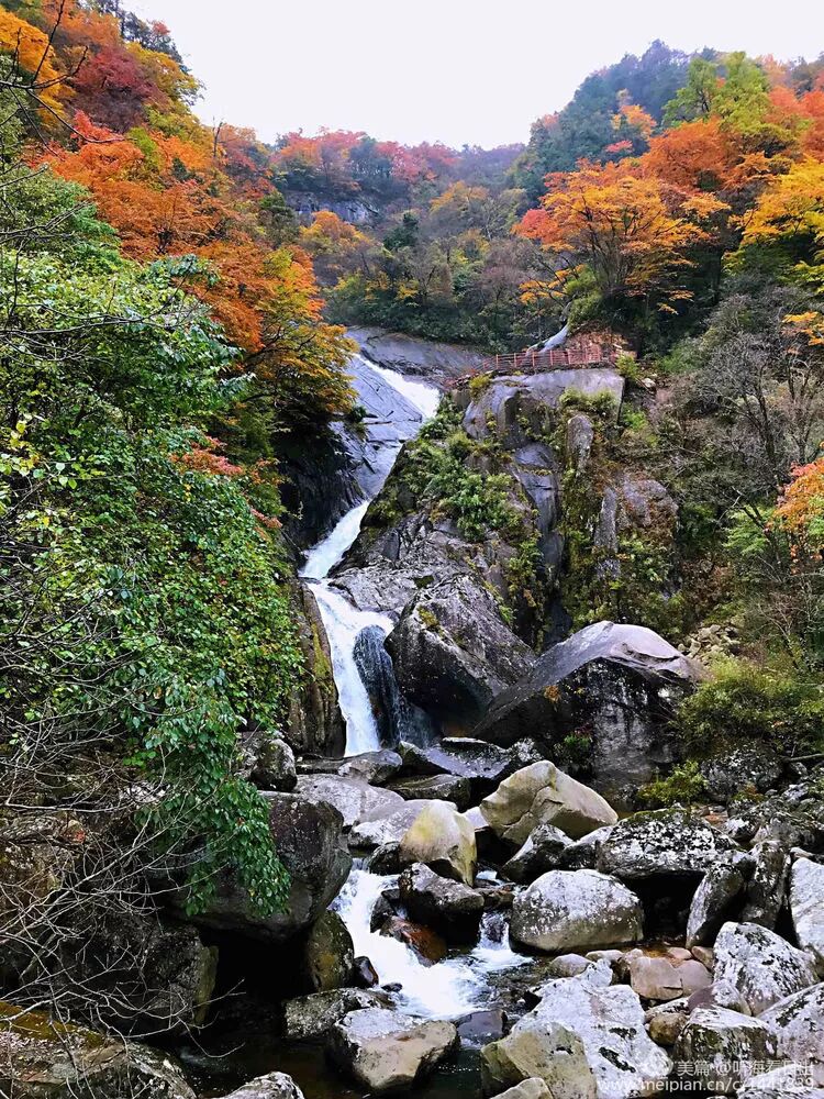 我们的游览路线是:景区门口-沿河流一路走到大瀑布-返回至云雾寺-杉树林-出景区。云雾山位于陕西省勉县东北部,秦岭南坡,海拔近2000米,风景区原生林保护较好,可以用“山高水长”来形容,空气清新宜人,一路走来,潺潺的水声伴你奔向大瀑布。当你踏着松林成荫的幽径,畅游山野,置身云雾山,浮躁的心境会渐趋平静。远望山谷峰岭,层林尽染,领略着山水风光的美感。