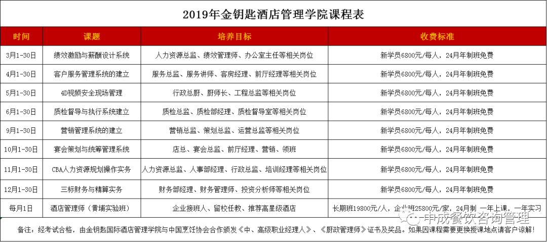 金钥匙学院中成伟业金钥匙酒店管理学院,是首家专为中国餐饮酒店业培养实战型中高级管理人才的专业学院,享有餐饮酒店业“黄埔军校”美誉。它依托中成伟业强大教育培训平台,同时与北京大学、中国饭店协会、中国好餐饮杂志社及各省市行业协会结为强大战略联盟,形成业内强大的资源网络与师资力量。自创办伊始,已成功为各大餐饮企业、星级酒店输送了批量实战型管理人才,并为餐饮总裁培养了优秀的接班人。毕业安排五星级酒店工作,可在中成伟业任职,也可留校任教,为餐饮酒店打造专业专长人才!