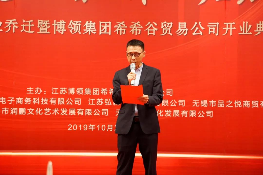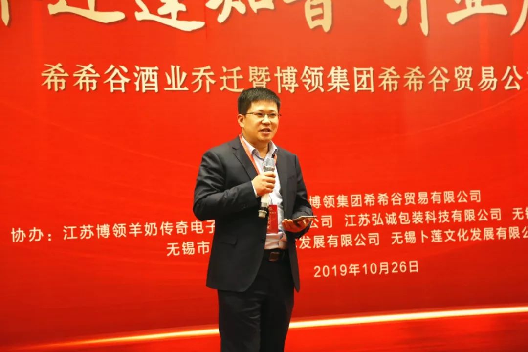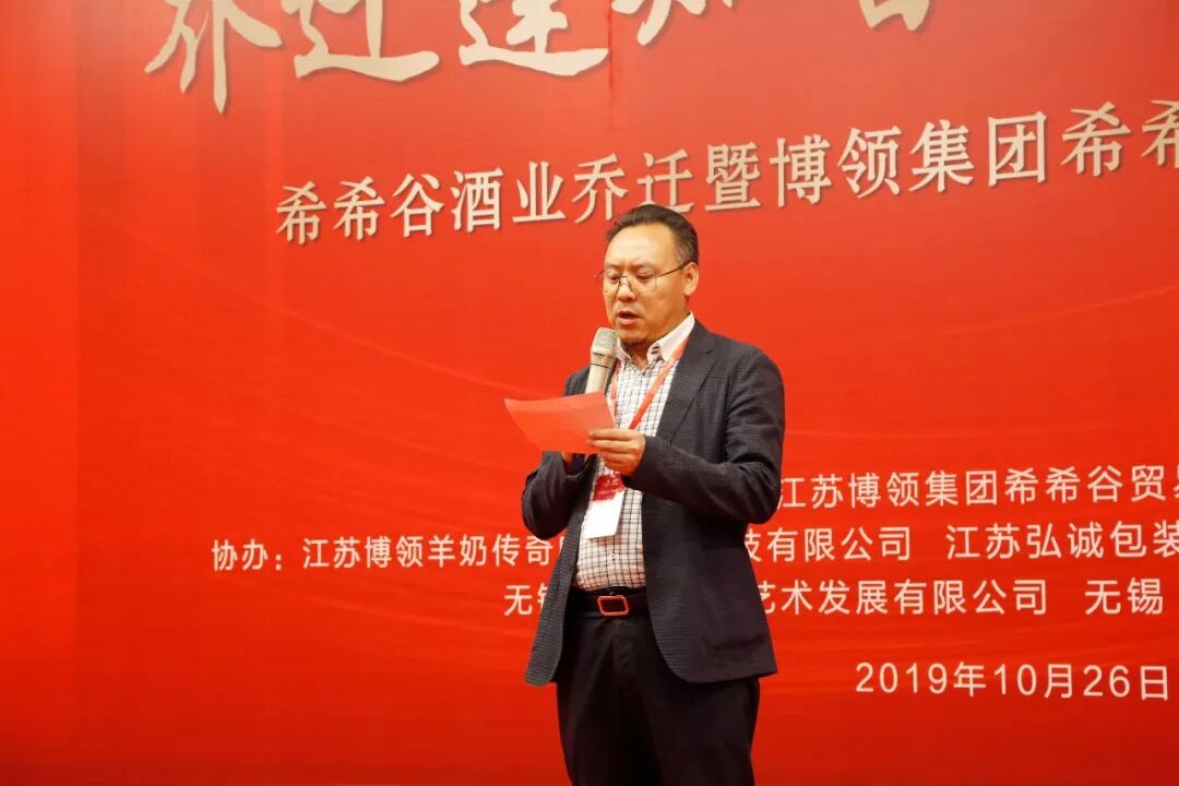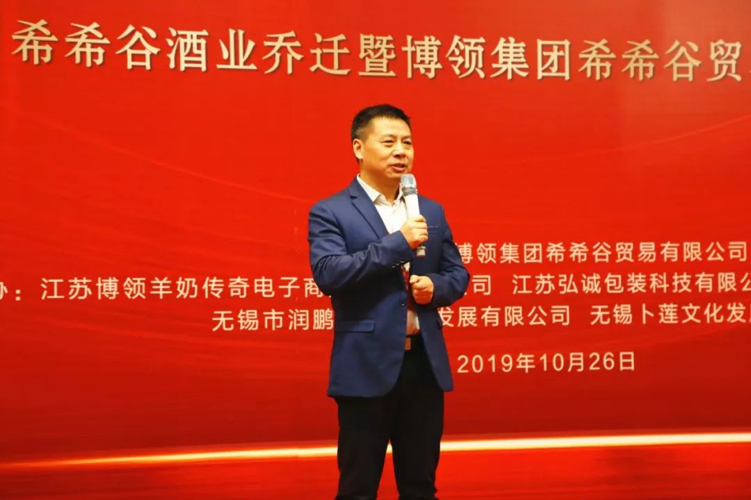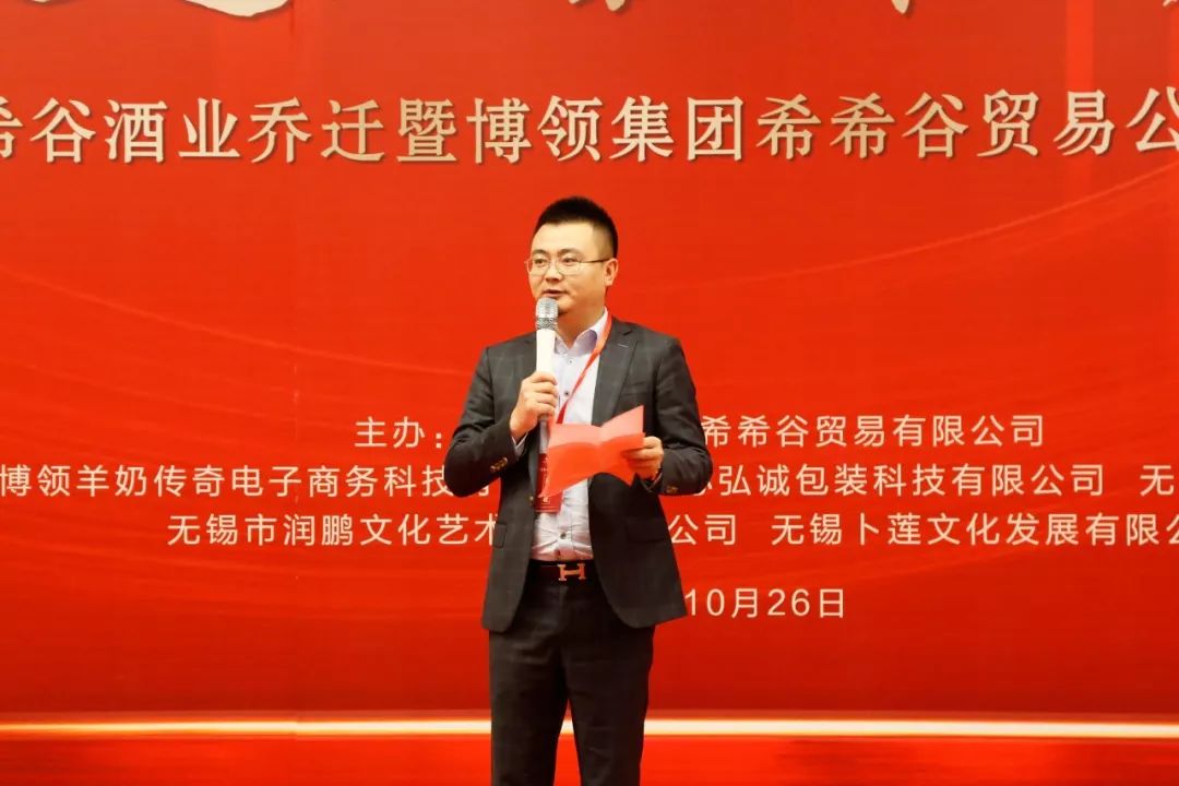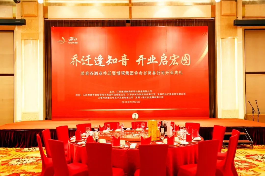 “乔迁逢知音,开业启宏图”,2019年10月26日,无锡希希谷酒业乔迁暨博领集团希希谷贸易公司开业典礼在无锡君来世尊酒店梅花厅举行。本次活动由江苏博领集团希希谷贸易有限公司主办,江苏博领羊奶传奇电子商务科技有限公司、江苏弘诚包装科技有限公司、无锡市品之悦商贸有限公司、无锡市润鹏文化艺术发展有限公司、无锡卜莲文化发展有限公司协办。