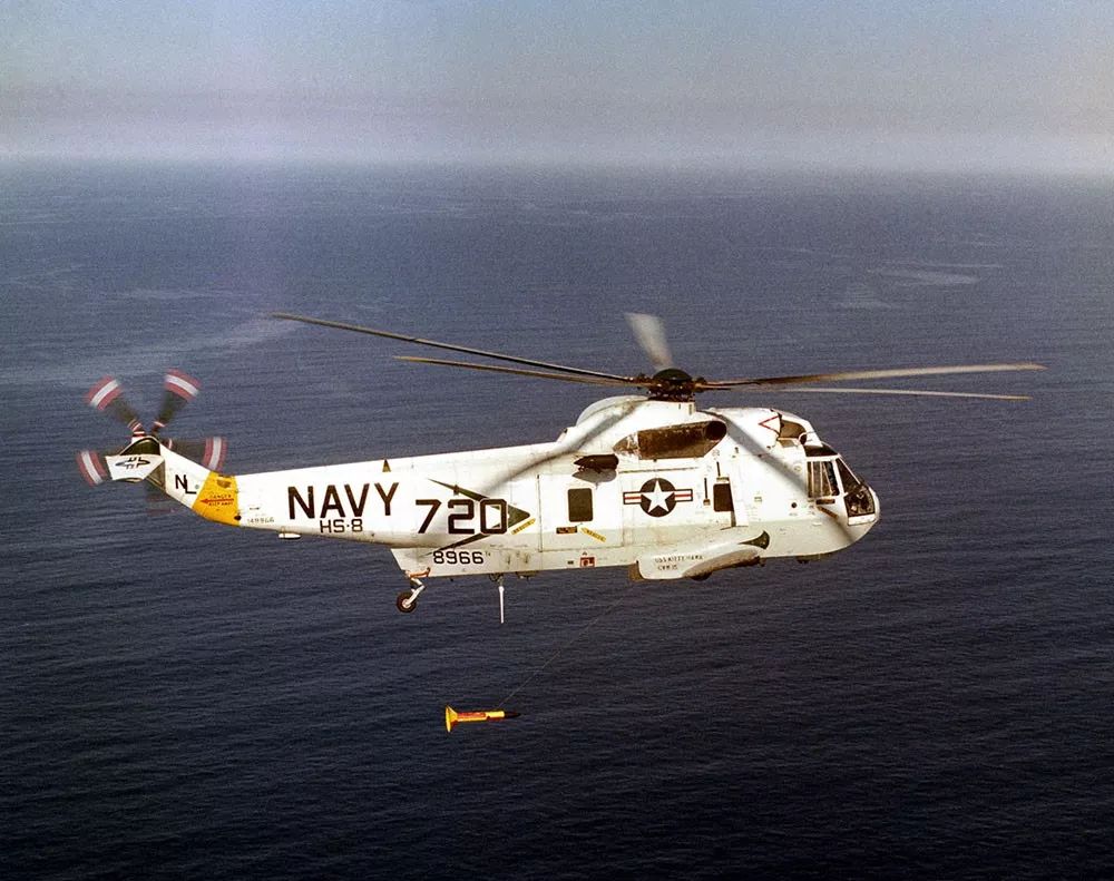 这是美军“海王”反潜直升机释放磁异常探测器进行搜潜时的状态,直升机就是这样吊着磁异常探测器飞行,能够避免直升机的磁场对该仪器的干扰。