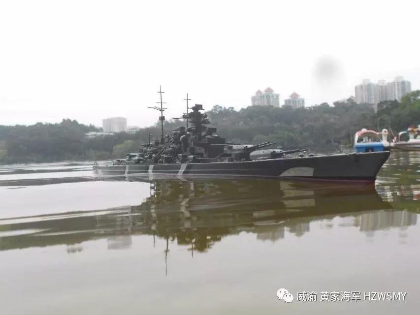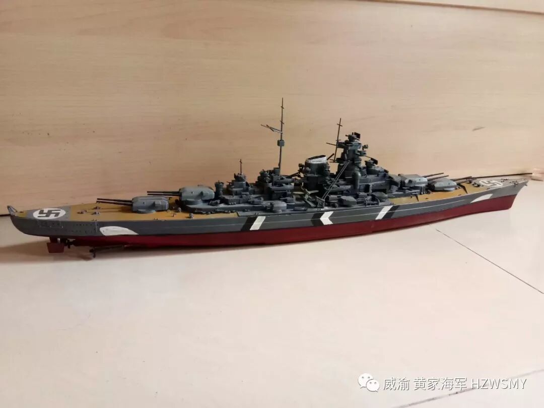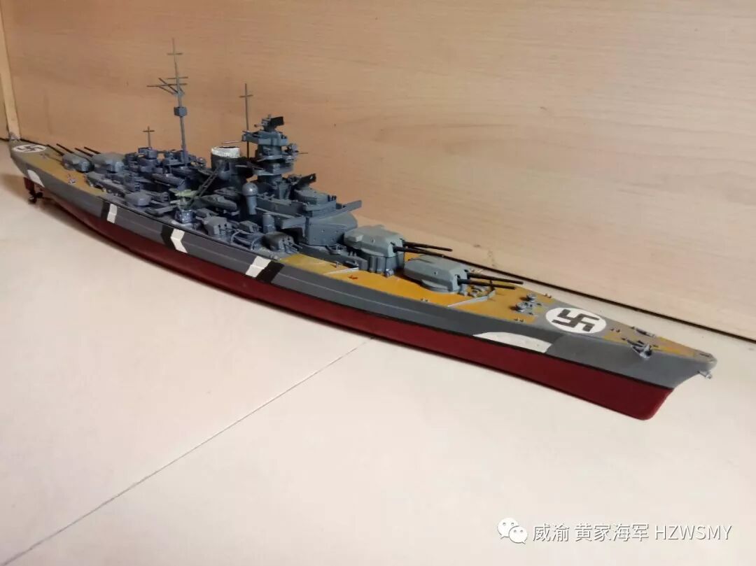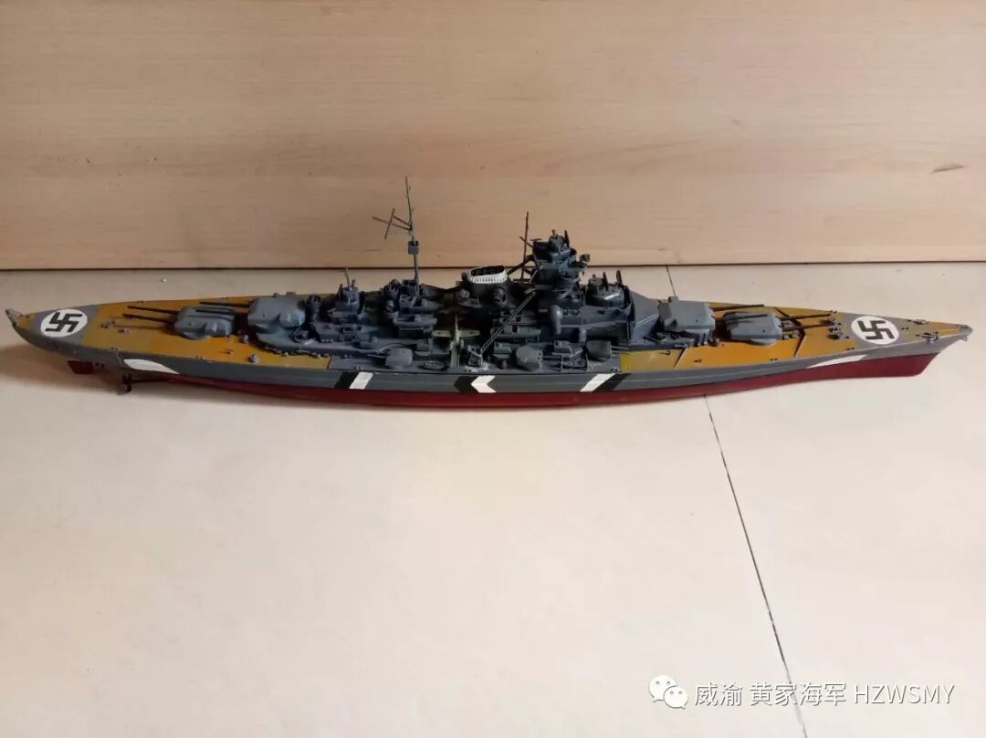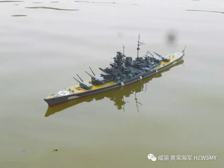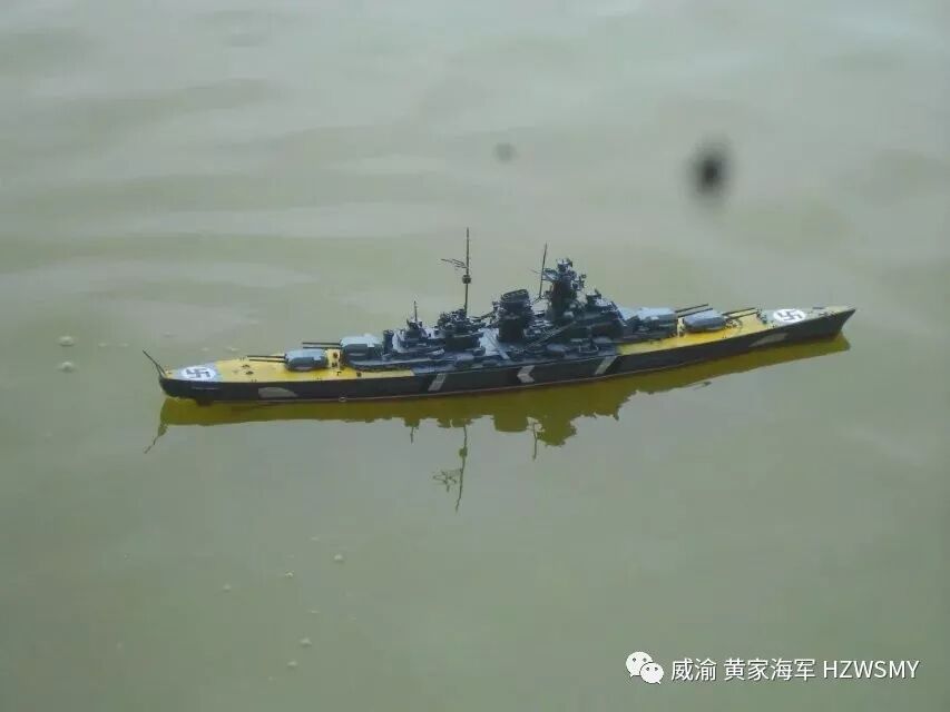 说起二战期间的纳粹德意志帝国海军的巅峰之作俾斯麦号战列舰应该有不少同好都知道的,首战击沉了英国皇家海军的骄傲胡德号战列巡洋舰,并且几乎一艘船单挑整个英国皇家海军舰队,最终被剑鱼鱼雷机击中尾舵而被一拥而上的英国皇家海军主力舰击成重伤而被迫打开通海阀自沉,而我黄家海军的俾斯麦号,则是2014年服役的,套材是小号手350比例的,静改动,也算是黄家海军第一次改装船模并且成功,选用的RC零件是三叫的轴套,9克金属齿防水舵机,好盈1060电调,两个130慢速电机,中间是180电机,福斯2.4G控控制