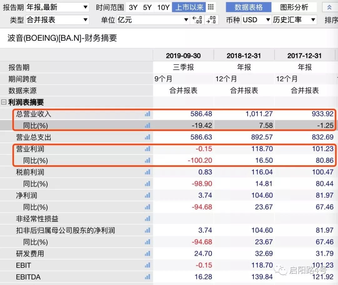 经营利润(或营业利润)为负数,2019年前九个月波音的营业利润亏损1500万美元,较去年同比减少100%,去年同期的营业利润是76.75亿美元。这也是自2004年以来,营业利润首次出现亏损,第一次“飘红”为负。