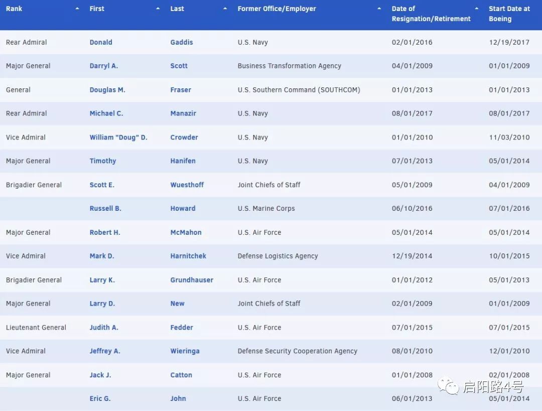 微妙的是,该数据库还统计了这些将军的退休日期和波音入职日期,其中有不少是“无缝对接”。2017年8月1日,美国海军少将从部队离职,同日他加入了波音公司。从数据看出,19位将军中有6位是“无缝对接”,当天离开部队当天入职波音。