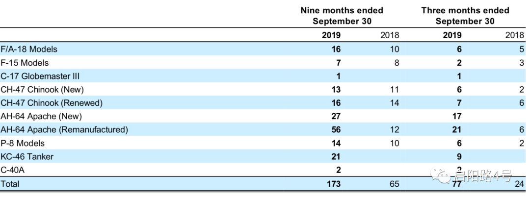 但最主要的任务还是生产军用飞机,2019年前三个季度波音一共交付了173架军用飞机,几乎是去年同期的三倍。仅第三季度就交付了77架军用飞机。