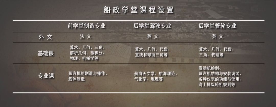 后来有一位船政学堂的老师在他的述职报告中记载:“我看到一些年轻人只是上四天课,就显示了他们极为敏捷的智力,八天以后,他们流利地拼读各种单词,在石板上写出所有的字母。无疑六个星期后,他们都会拼读,还有好些人还将会书写。” 学堂的课程十分广泛,相当于我们在中学时期就要学完比大学四年还要多得多的课程。比如前学堂制造专业的学生要掌握船舶和轮机的制造,必须学习法文、数学、物理和机械学,以及专业实践课等等