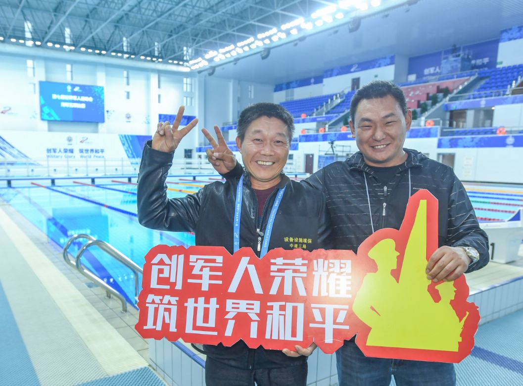 海军五项比赛开始后,场馆建设者们纷纷来到自己建设的场馆为中国军人运动员加油。