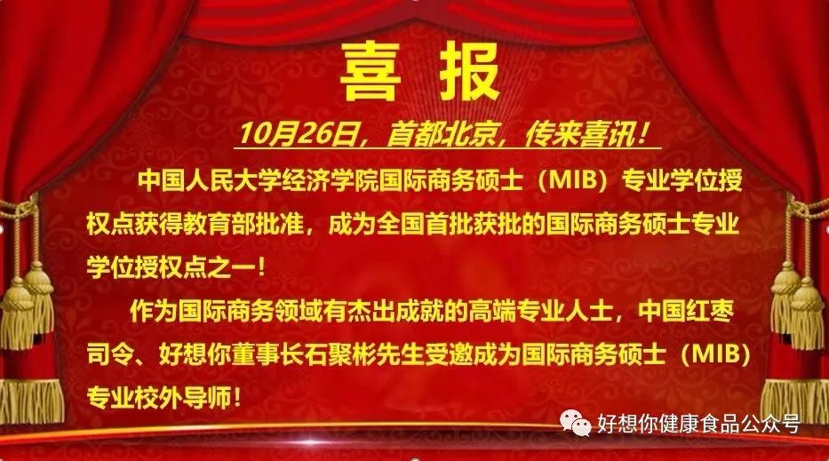10月26日,首都北京传来喜讯!好想你董事长兼总经理、红枣司令石聚彬受聘成为中国人民大学经济学院国际商务硕士(MIB)校外导师!