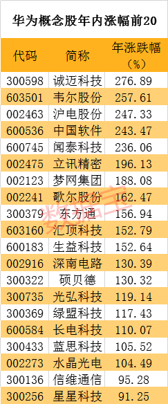 但所谓几家欢喜几家愁,今年以来华为概念股涨跌幅度参差不齐,年内累计涨幅最大的是诚迈科技,累计涨幅276%。