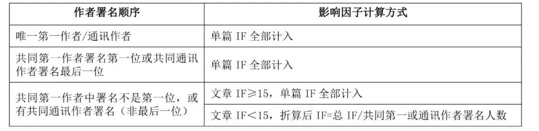 (2)署名文章类型必须是论著和研究型述评,文章分区按照中科院大类分区。文章署名必须是第一作者或通讯作者(本学院毕业生,要求第一作者的第一单位必须为武汉大学中南医院);影响因子计算方式如下表: