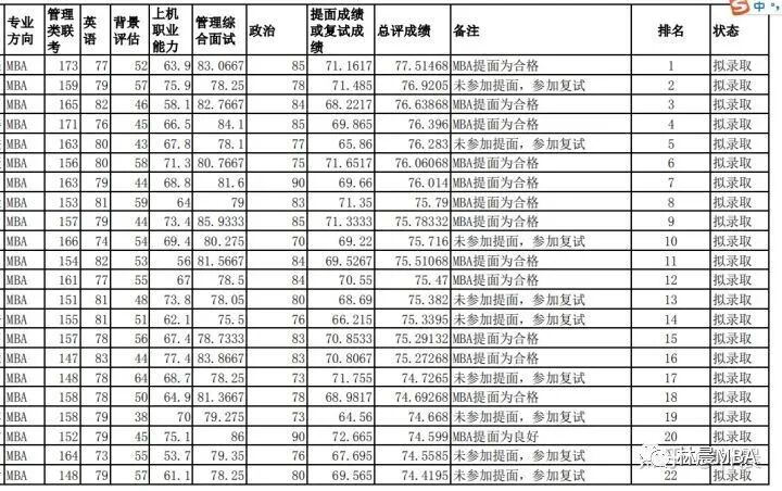 武汉大学MBA官方也给了政策,未参加提前面试,管理类联考且第一志愿报考武汉大学,若初试成绩达到武汉大学自主划定分数线,参加复试且成绩“合格”,按综合成绩=(管理类联考综合能力+联考英语)/3)*60%+复试成绩*40%排名,根据可用招生计划从高到低依次拟录取,额满为止。