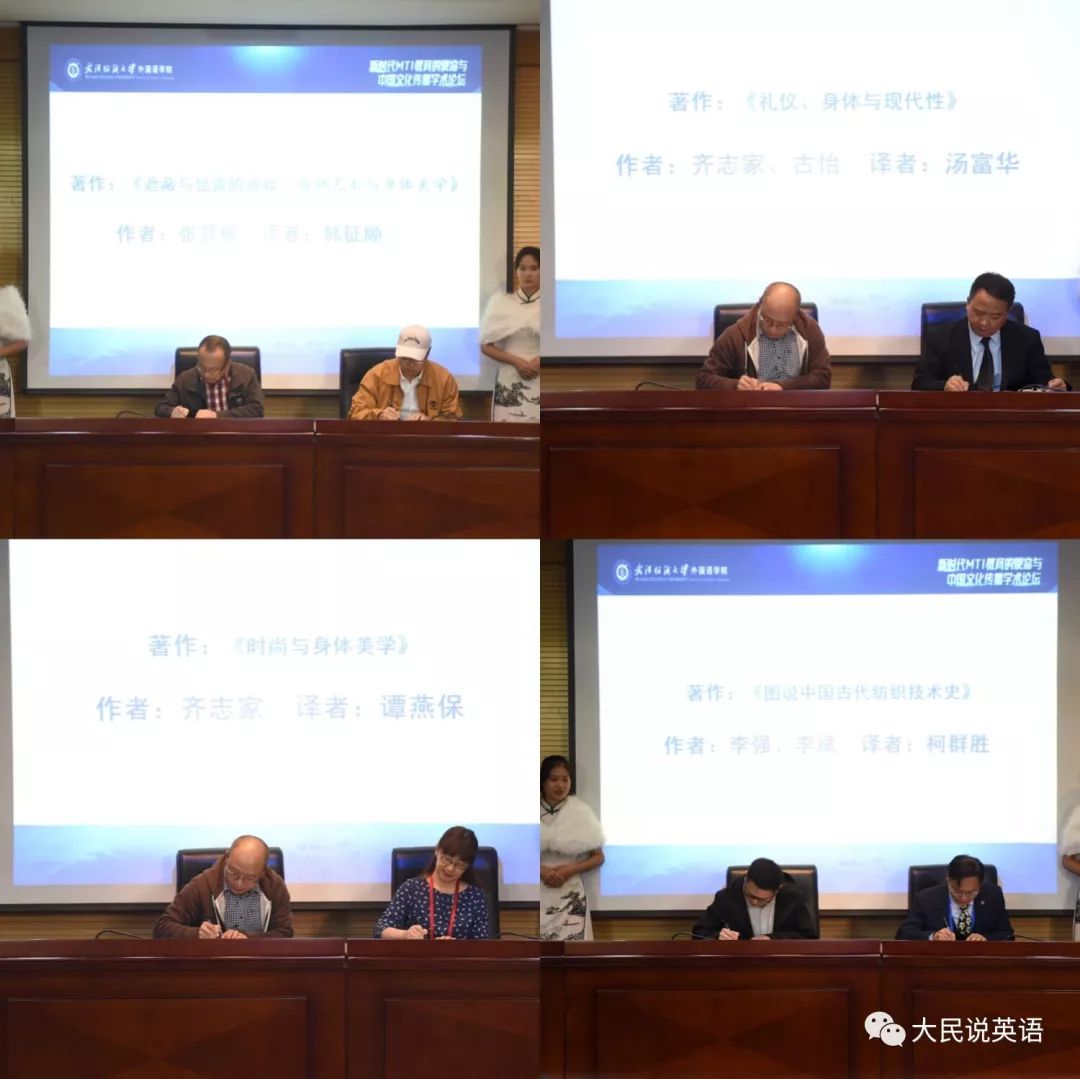 会上还举办了专著翻译合同签约仪式。部分专著的作者、出版社代表和译者签订了9套书的委托翻译合同。为发扬我校特色学科的优势,我院细甄选了校内知名学者的中文专著10部以及外国专家的2部英文著作,准备将其翻译出版。我们将以MTI教育为引线,来实施语言服务,服务于文化交流,服务于中国文化传播,服务于武汉纺织大学的优势学科。