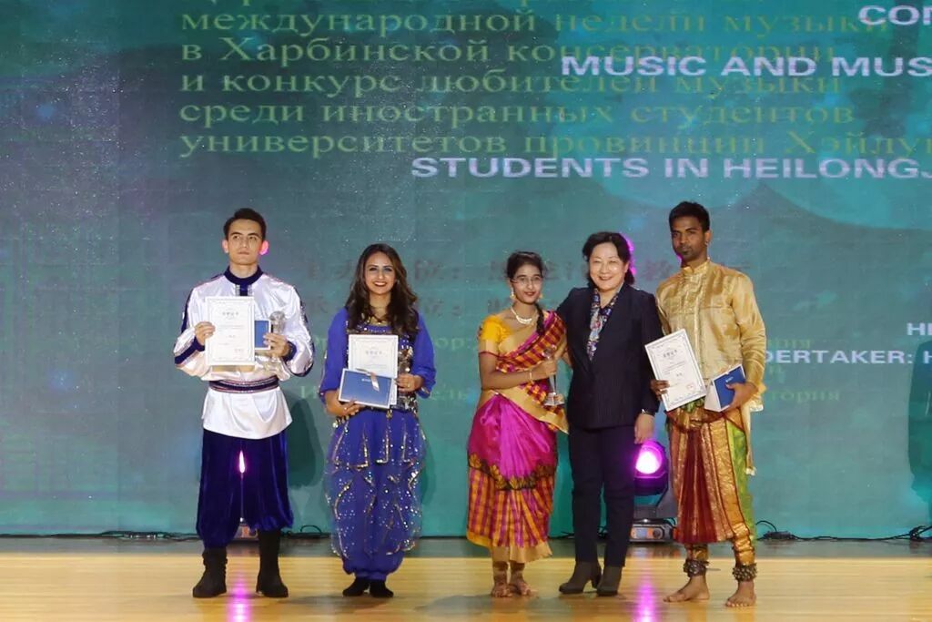 经七国专家评委打分,最终齐齐哈尔医学院选送的舞蹈《婆罗多舞》、黑龙江大学选送的舞蹈《卡琳卡》、哈尔滨医科大学选送的舞蹈《Unity in Diversity》荣获一等奖;哈尔滨师范大学选送的舞蹈《FULFIL》、黑龙江大学选送的歌曲《舷窗外的地球》、哈尔滨商业大学选送的舞蹈《哈萨克斯坦民族舞蹈》、黑龙江中医药大学选送的歌曲《岐黄之声》、哈尔滨剑桥学院选送的歌曲《Belle》、哈尔滨工业大学选送的现代舞《16 Shots Lip&Hip》荣获二等奖;哈尔滨工程大学选送的舞蹈《北极光》、牡丹江师范学院选送的街舞《The voice of street》、哈尔滨理工大学选送的舞蹈《俄罗斯串烧舞蹈》、 齐齐哈尔大学选送的歌伴舞《采红菱》、舞蹈《uh-NO break》、 黑河学院选送的器乐表演《光年之外》、东北林业大学选送的舞蹈《骏马奔腾》,东北农业大学、黑龙江东方学院、黑龙江外国语学院、黑龙江大学、佳木斯大学学生演唱的中文歌曲串烧荣获三等奖。王淑云副厅长,关健书记、冈特瓦尔格先生,徐长勇副书记、宋立权副院长分别为荣获一、二、三等奖的留学生代表颁发证书、奖杯。