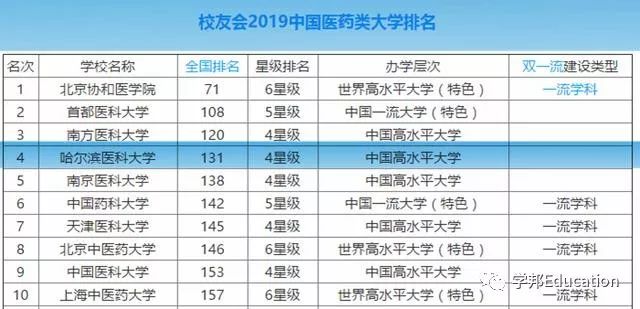 校友会2019年中国医药类大学排行榜中,哈尔滨医科大学高居医药类大学第四位。