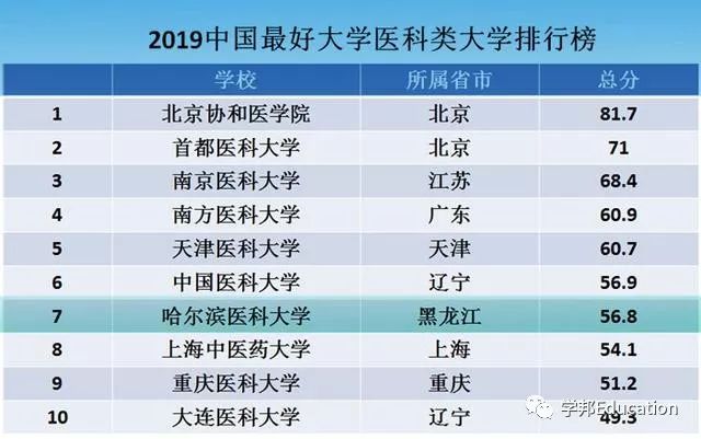 1,2019年软科中国最好医科大学排行榜中,哈尔滨医科大学排名全国第7位。