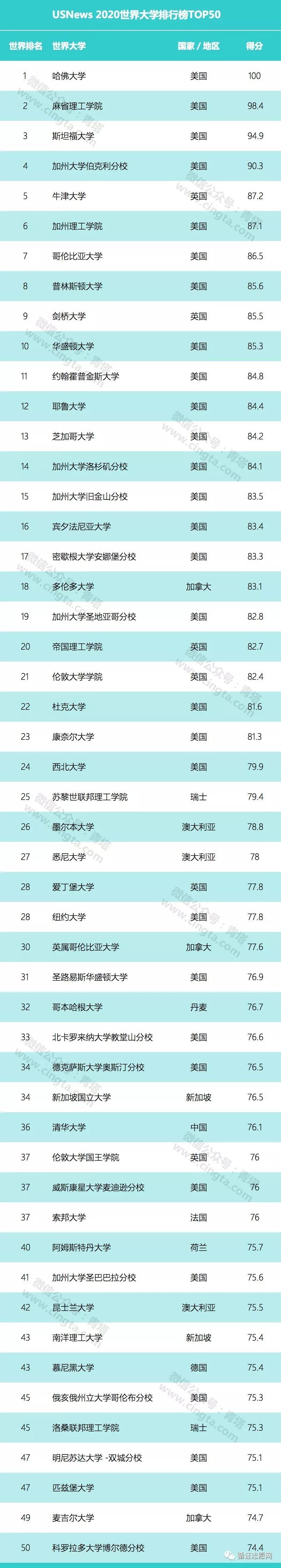 今年的USNews排名中,美国高校依然占据绝对优势。哈佛大学、麻省理工学院和斯坦福大学依然位居前三位,和去年保持一致。排名第四到第十的高校是加州大学伯克利分校、牛津大学、加州理工学院、哥伦比亚大学、普林斯顿大学、剑桥大学、华盛顿大学。TOP50高校中,美国高校共有29所,占比达到58%,英国高校共有6所,澳大利亚和加拿大各有3所,这些国家上榜高校较多。中国仅有1所入围TOP50,相比美国和英国还有很大差距。USNews2020世界大学排行榜TOP50高校详细名单如下: