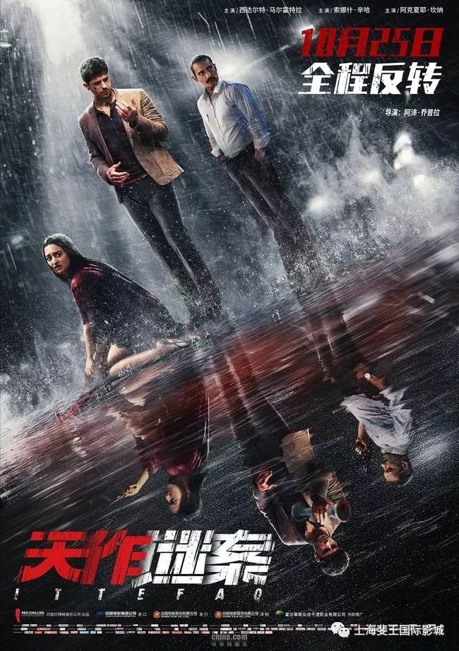 细心的观众可以发现,这款海报还蕴藏着另一个玄机。将画面倒置,就会看到水中倒映出的另一个版本。玛雅手持刀具,表情狠辣;维克拉姆拿着沾血的钝器,陷入沉思,而在暗处的警官德夫早已掏出了手枪,缉凶蓄势待发。随着警方调查的不断深入,玛雅出轨的证据已经被揭露,她的形象早已不是无辜主妇这样简单。而维克拉姆手中的钝器正是杀死律师的凶器,但他所露出的表情却全然不是杀人后的慌乱,反而充满了迷茫,仿佛并不知道它为什么会出现在自己手中……凶手身份莫辨,嫌疑人各个心怀鬼胎,《天作谜案》已然将烧脑反转贯彻到底。
