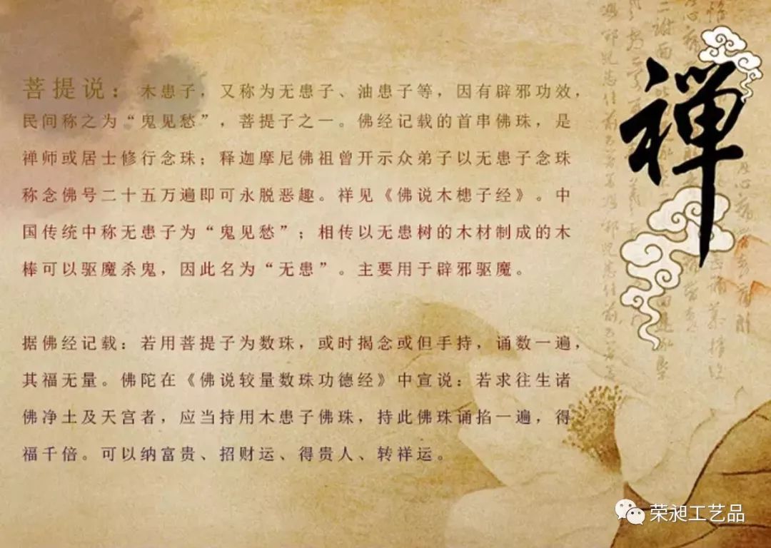 无患子,又称为木患子等,菩提子之一。佛经记载第一串佛珠,是禅师或居士修行首选念珠;释迦摩尼佛祖曾开示众弟子以无患子念珠称念佛号二十五万遍即可永脱恶趣。祥见《佛说木槵子经》。中国传统中称无患子为“鬼见愁”;相传以无患树的木材制成的木棒可以驱魔杀鬼,因此名为“无患”。主要用于辟邪驱魔。