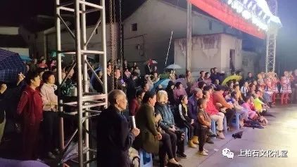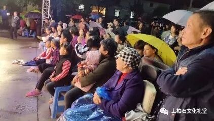 晚会吸引许多从外地赶回来的村民,图为村民冒雨观看