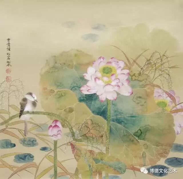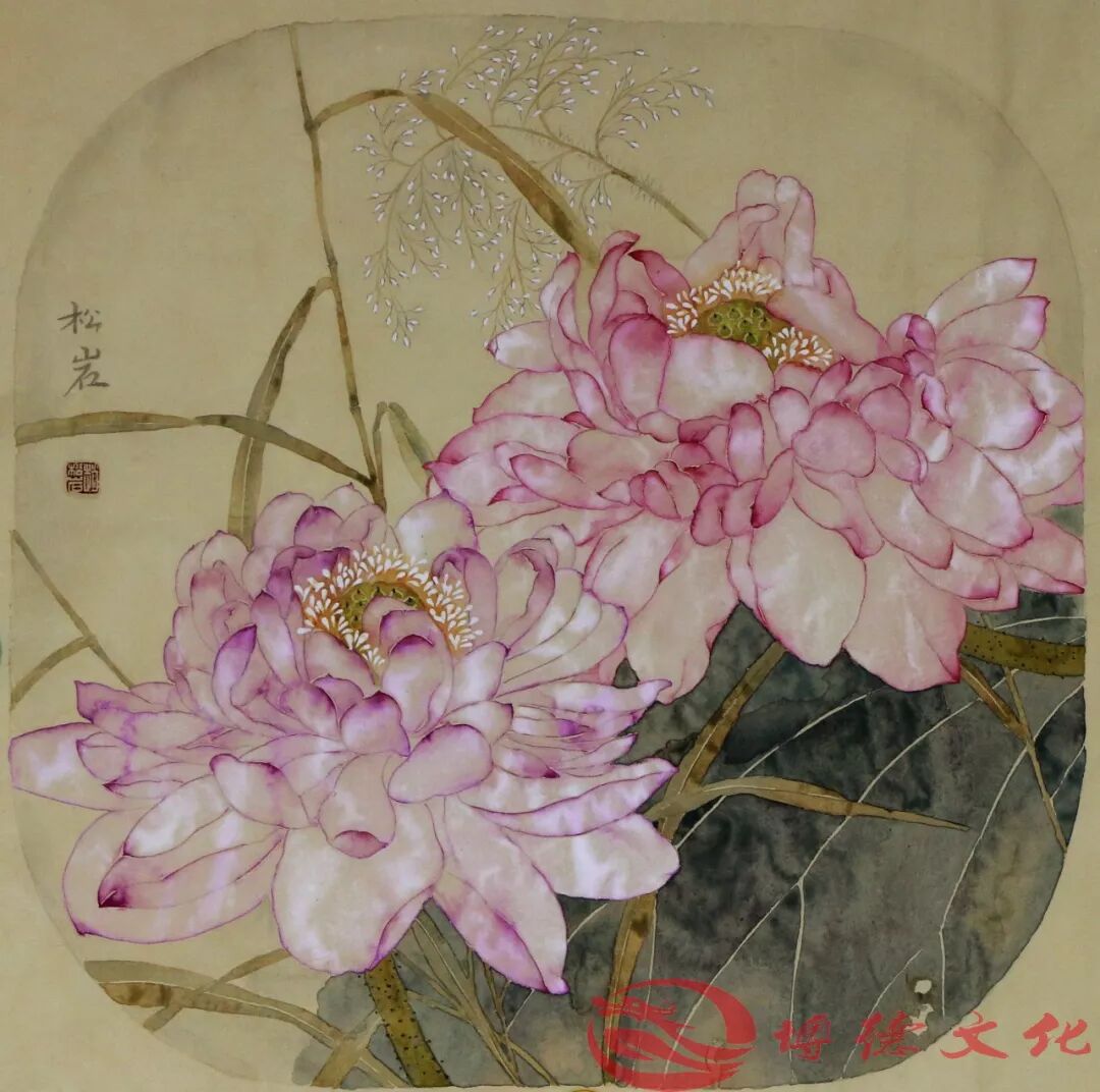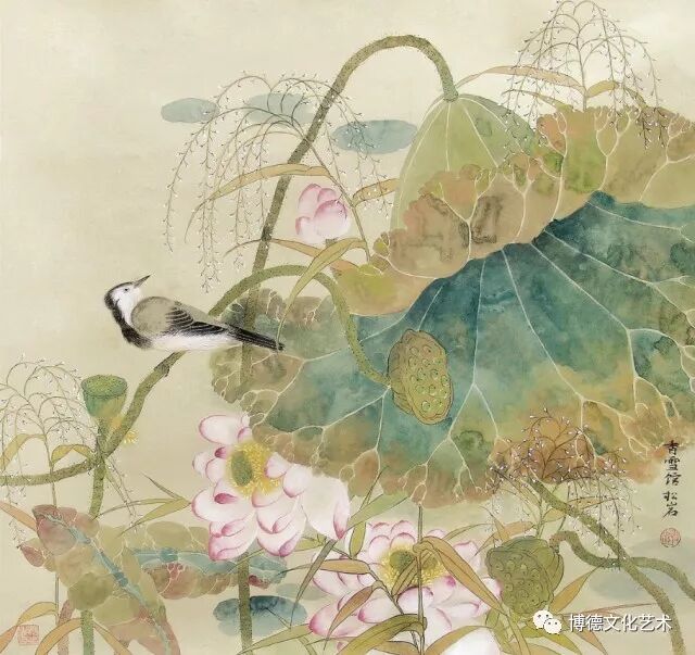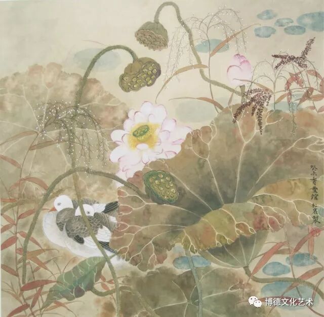 一片浓绿的荷叶上,映衬着两朵清润雅致的荷花,错落的枝叶与细小的花儿将荷花点缀的更加淡雅别致,两朵荷花之间颜色略有差异,也增加了画面的趣味性,使画作更加灵动、活泼。“荷花”寓意着纯洁、坚贞、吉祥,中国古代民间就有春天折梅赠远,秋天采莲怀人的传统,经常以荷花作为和平、和谐、合作、合力、团结、联合等的象征,它纵使是在污浊的环境中也能洁身自好,保持自己高尚的品德,这也是一种君子行为的象征。