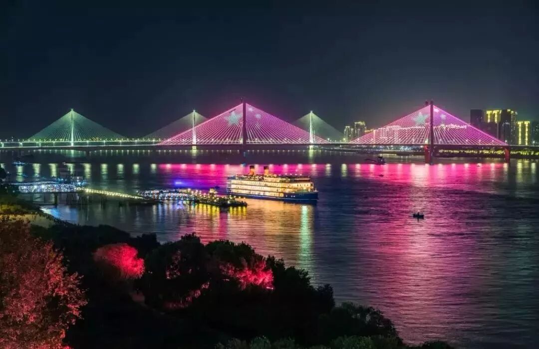 沿江两岸、高架桥上金色光带引领,高亮度高色温,迎宾之门渐次打开,展现武汉风貌。过渡段建筑暖光色基调,统一区域建筑立面肌理。以“一带、两面、四组团”的城市夜景亮化总体框架,既融入军运氛围,又充分考虑了城市尺度照明,通过整治分级、合理照明、严控质量等方式,有效控制投入,减少光污染。