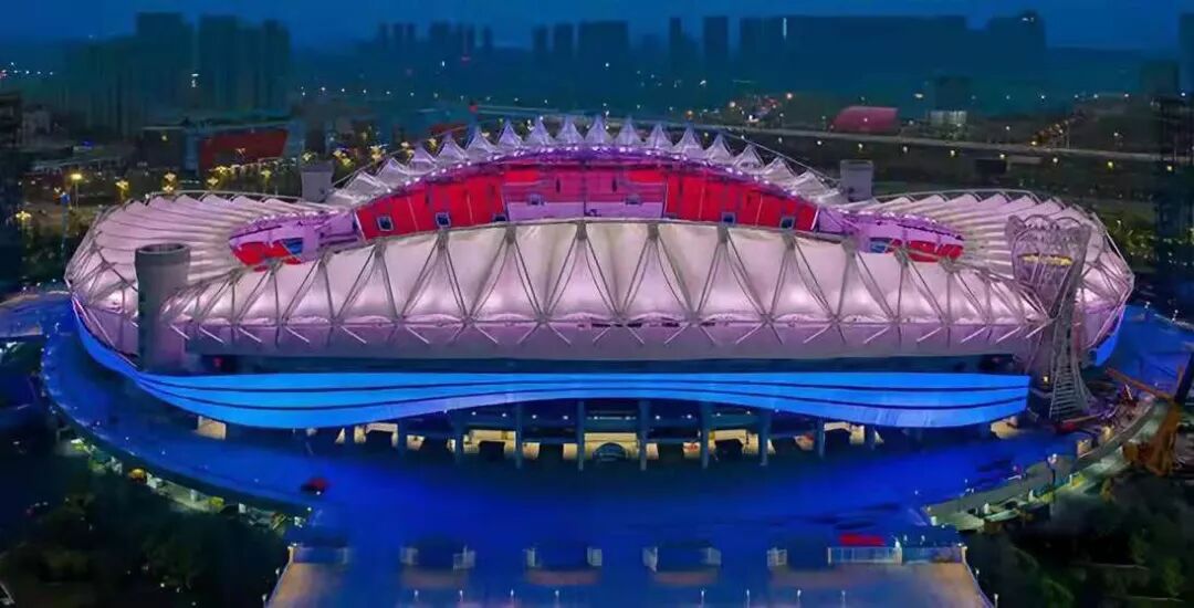 武汉军运会场馆设施按照“满足赛事需求、方便赛事组织、体现绿色生态、益于赛后利用”的原则进行规划建设。主场馆照明活化建筑“飘带”结构,“襟飘带舞”特色展现,地面鲜花光毯光随影动。体育馆与游泳馆类圆屋顶亮显,投影传达荆楚文化,打造视觉焦点。