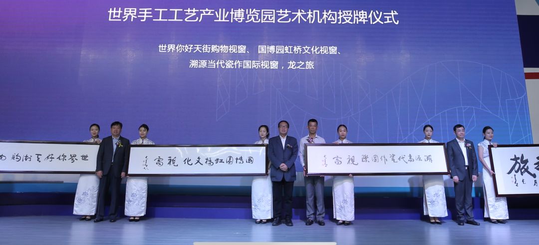本次开幕式的最后一个亮点,“泛长三角工艺美术玉石创作基地”也在世界手工艺产业博览园挂牌成立。上海市虹桥商务区管委会、市经信委、青浦区政府、上海工艺美术行业协会领导对落户长三角区域、大虹桥的艺术机构代表授牌,包括:“百年北玉文化视窗”、“溯源当代瓷作国际视窗”、“龙之旅”、“中国艺交所故宫文物视窗”“世界你好天街购物视窗”、“青田名家名石文化视窗”、“国博园虹桥文化视窗”“潮州非遗文化视窗”。以此激励各位艺术馆共同为上海建设国际化综合大都市的战略愿景砥砺前行。