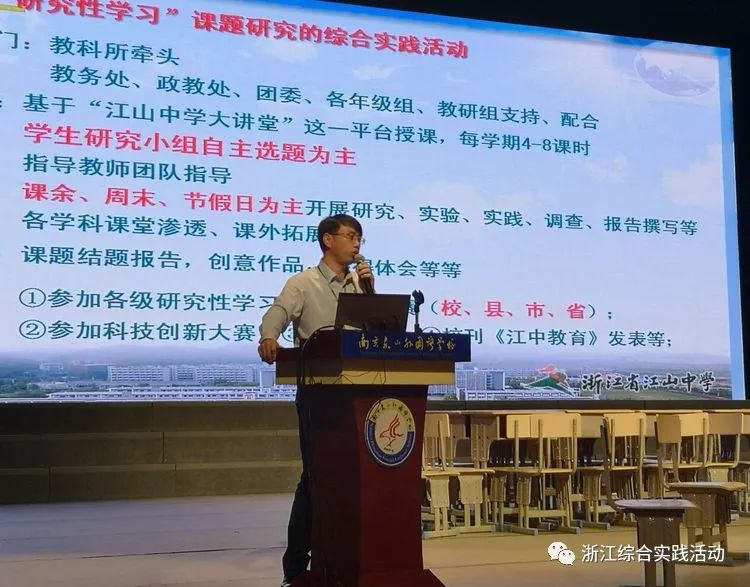 江山中学徐敏副校长在中学分论坛上作了《基于学生核心素养发展的高中综合实践活动课程的探索与实践》发言,分享了江山中学是如何通过开展综合实践活动课程来落地学生核心素养的发展经验,特别介绍了江山中学基于高中学生的学业基础、思维方式和学校传统,把开展学生“研究性学习”课题研究作为三个年级常态化开设的综合实践活动课程。通过研究主题的选择和模仿科学家的研究过程,推动学生的人文底蕴、科学精神、学会学习、健康生活、责任担当、实践创新等核心素养的发展。