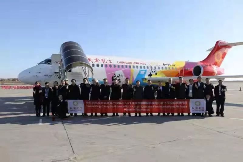 昨日,一架身披成都航空航徽“太阳神鸟”涂装、国籍注册号为B-603P的国产喷气支线客机ARJ21飞机从哈尔滨机场起飞,历经1小时03分的飞行,平稳降落在符拉迪沃斯托克国际机场,标志着ARJ21飞机首条国际航线成功开通。