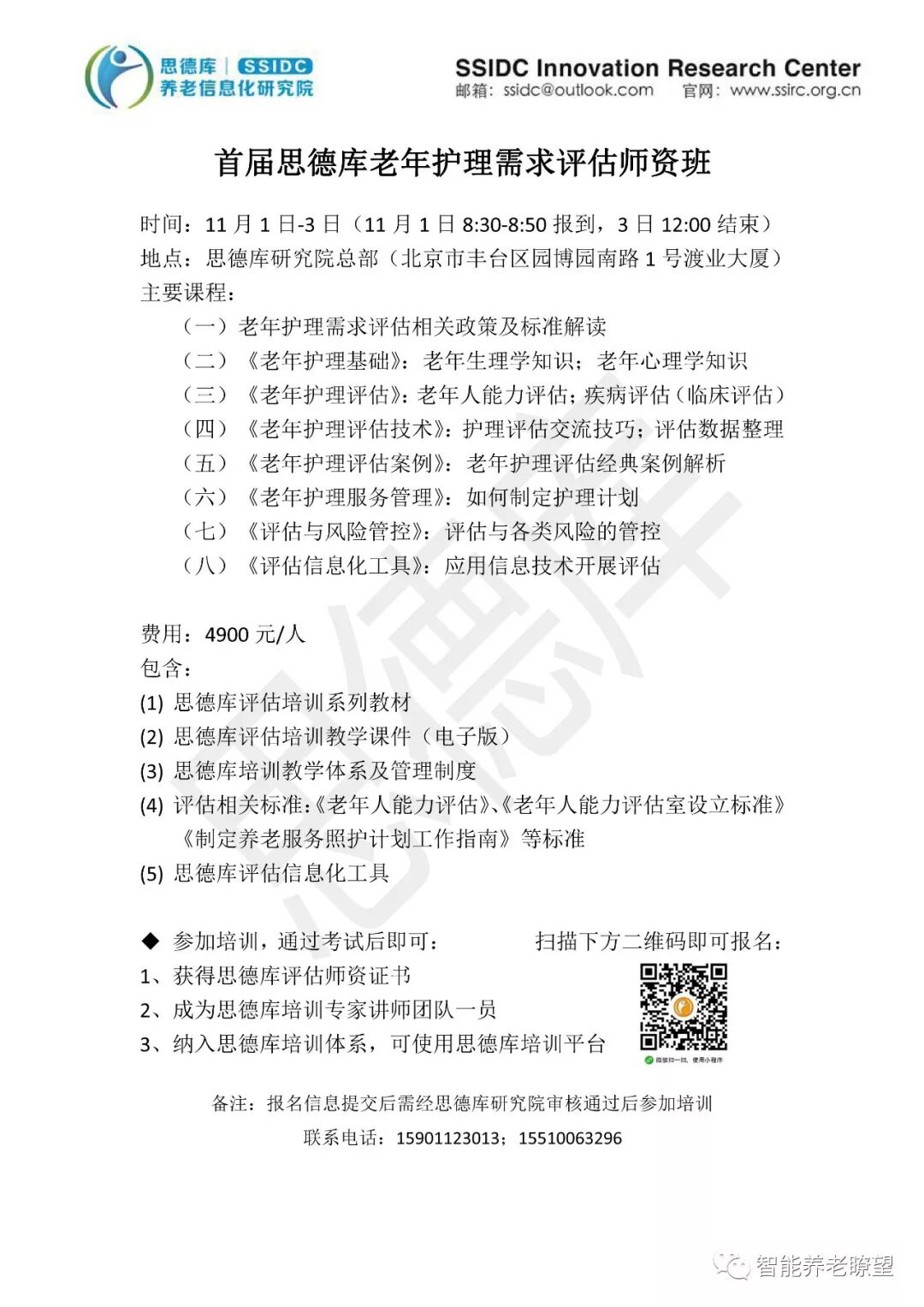 为积极响应卫健委政策要求,加强养老服务专业人才培训,推动养老服务评估事业快速发展,思德库养老信息化研究院将于2019年11月1日-3日在北京举办“首届老年护理需求评估师资班”,由最顶级的专家讲师带来精彩课程。