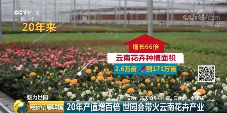 20年来,整个云南的花卉种植面积从2.6万亩发展至目前的171万亩,增长了66倍;而云南花卉总产值从4.7亿元增长到了525.9亿元,增长了112倍。