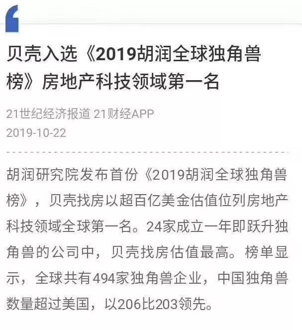 胡润研究院发布首份《2019胡润全球独角兽榜》,贝壳找房以超百亿美金估值位列房地产科技领域全球第一名。