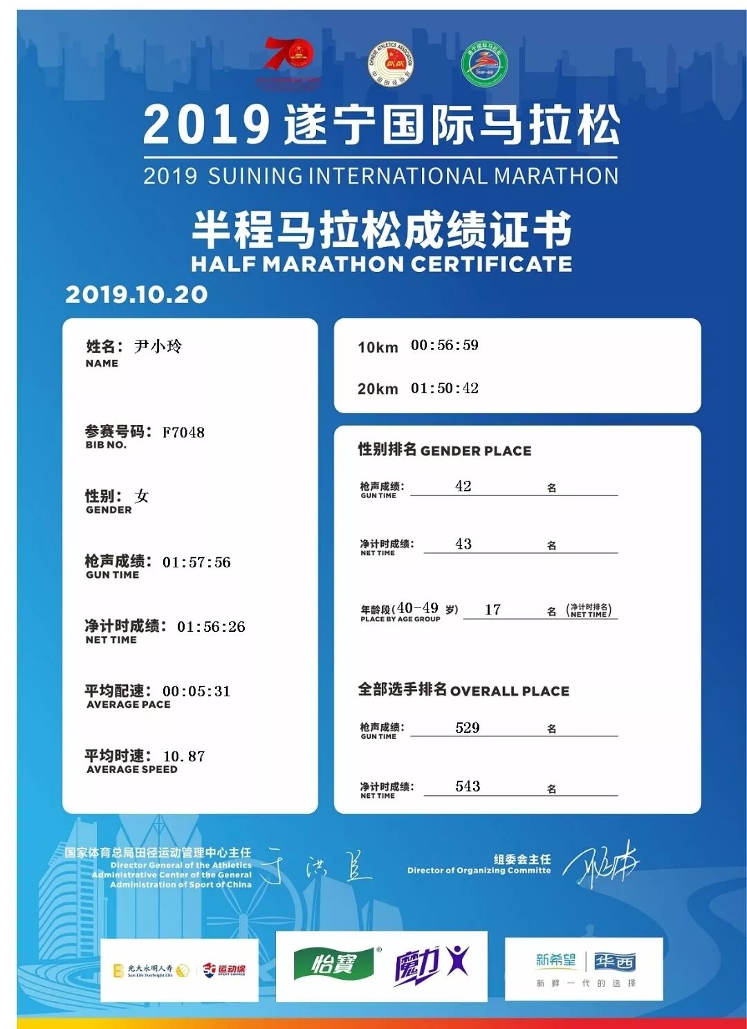 旁边人行道上隐隐的传来一幼稚的声音“阿姨!加油!”我报以无赖的微笑,颠着向前行。隐隐的听到了音乐的声音,终点!!!终点!!!哈哈哈我要完成了!冲鸭!!五百米,三百米,红地毯!!1小时57分的声音传来了。