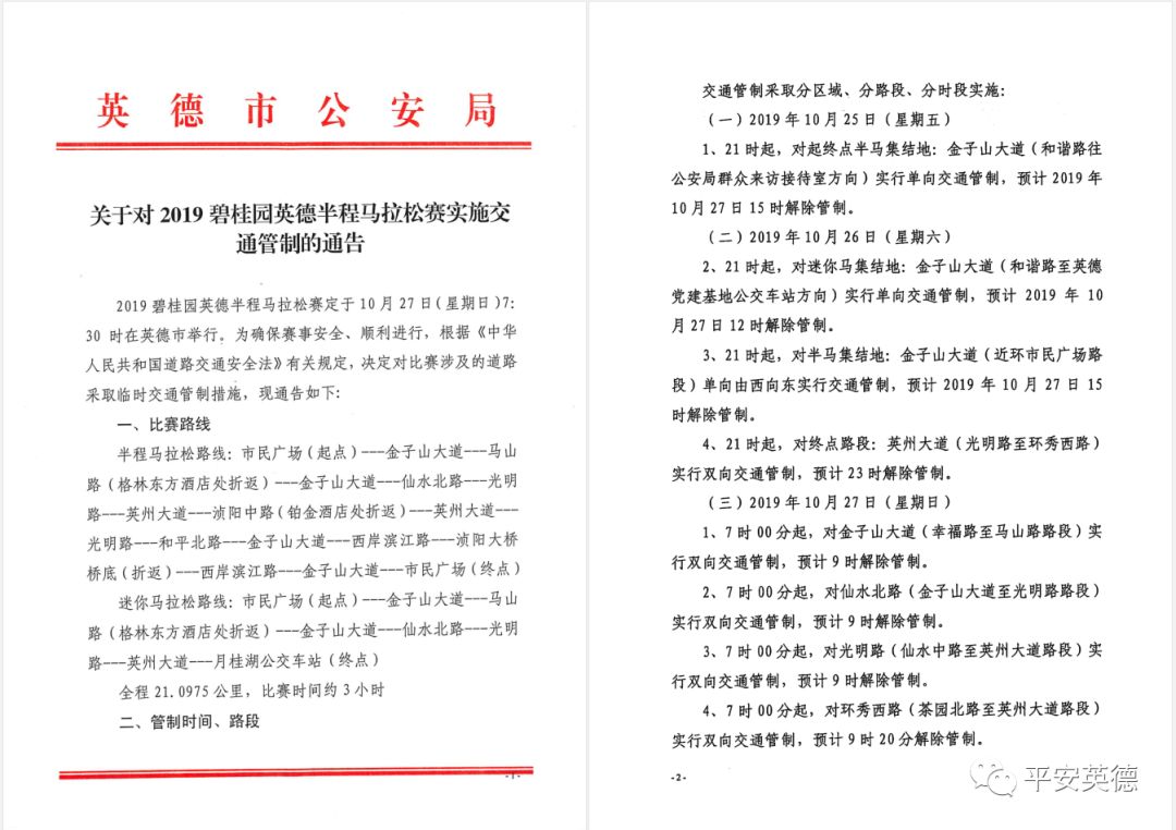 4、21时起,对终点路段:英州大道(光明路至环秀西路)实行双向交通管制,预计23时解除管制。