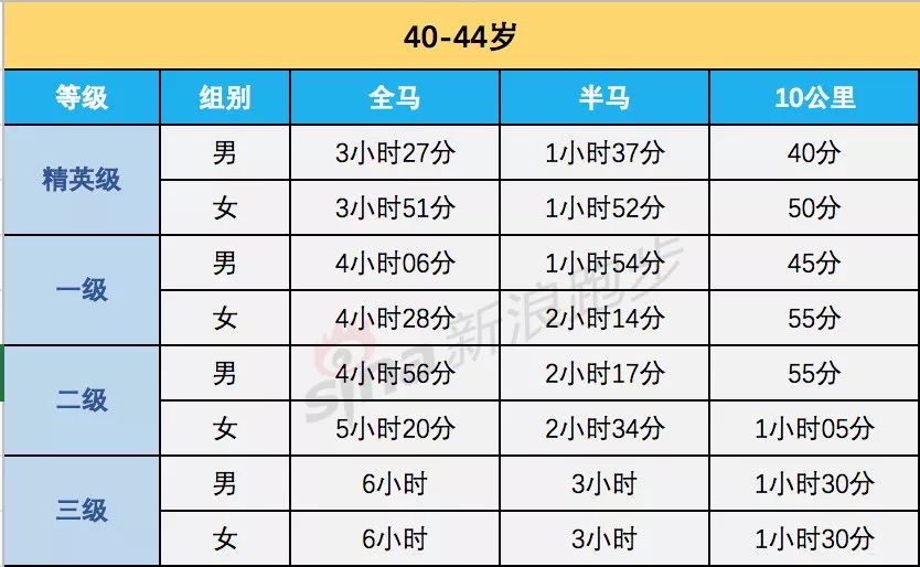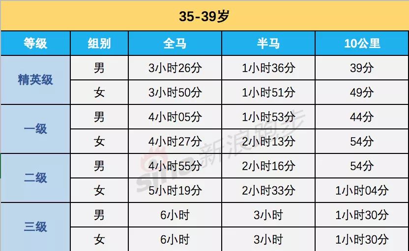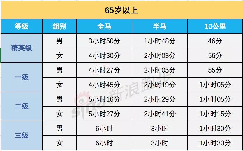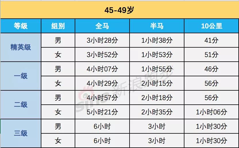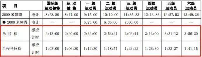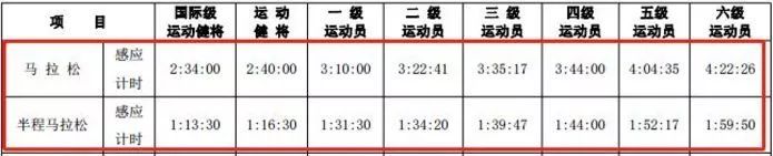 如果你的完赛成绩远领先上面大众跑者的成绩标准,那就来对照下表,来看下专业跑者的等级标准: