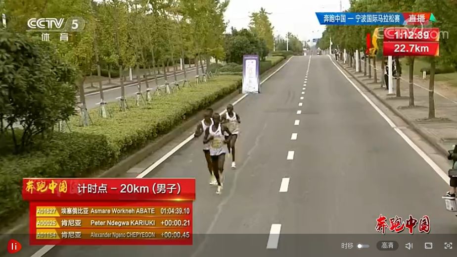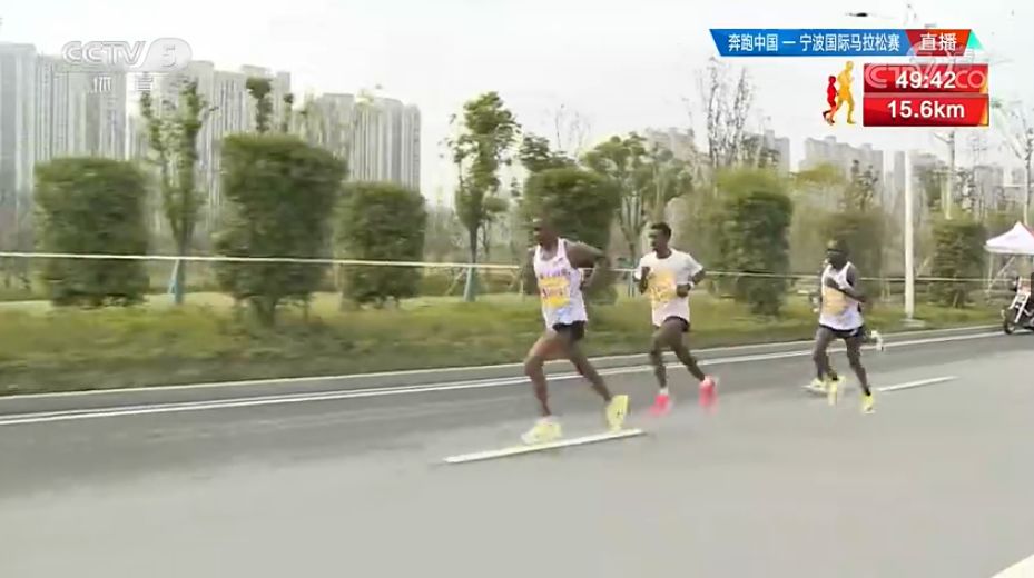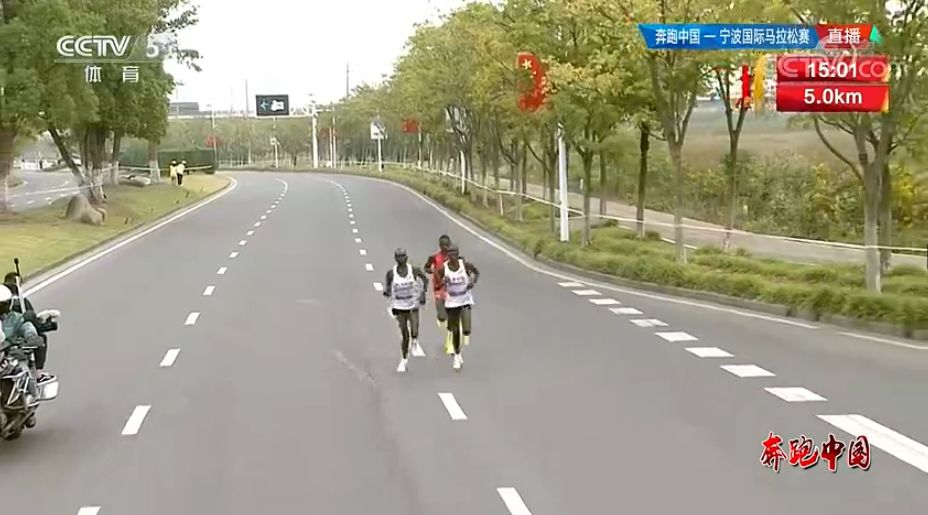 全程领先集团是四位黑人选手,随着电视直播信号切入几轮人物纪录片,男子领跑的几位已经跑过15公里
