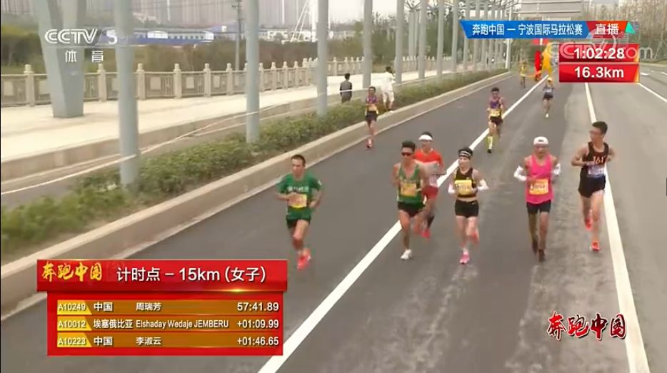 女子领跑的周瑞芳,在15公里处用时57:41,领先后面的女子第二、第三名约1分钟左右