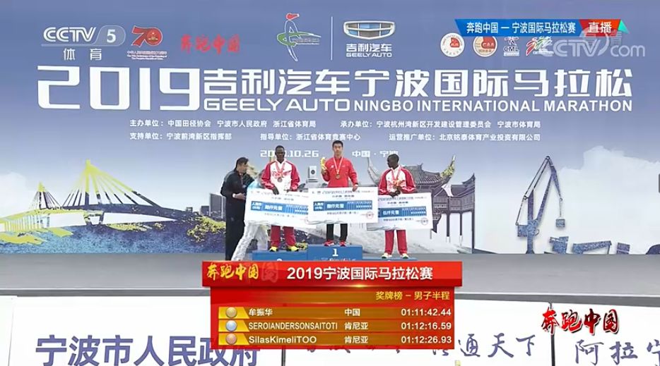 半程冠军在上午9点10分左右产生,牟振华以1:11:42的成绩率先冲线,秒杀了身后三位黑人