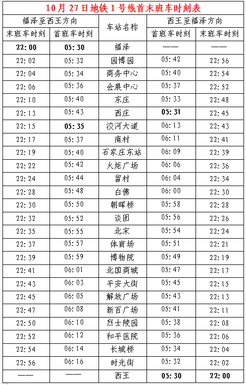 ①比赛当天(10月27日)石家庄地铁全线首班车时间将提前至5:30,并从西向东加密两列班车,5:30—6:30期间行车间隔10分钟。