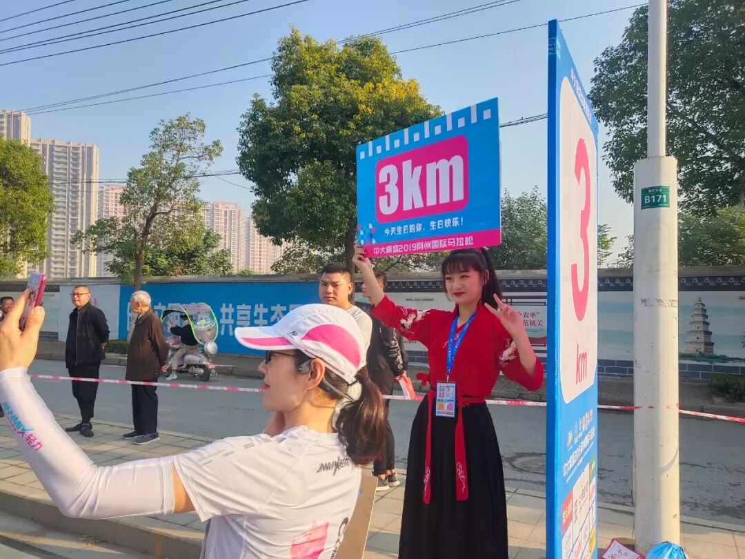 荆马的标识识别度很高,放在一众城市马拉松标识里面,我们可以一眼看出,但其他很多城市马拉松的标识谁是谁,没几个人人能分辨得清楚。 荆马每公里的公里牌边上都有一个漂亮的小姐姐,穿着古楚国的服装,手举一个小的公里牌。很多跑友都停下脚步和小姐姐合影,不能把小姐姐带走,一定要把“楚国故都,三国名城”装进手机带走。
