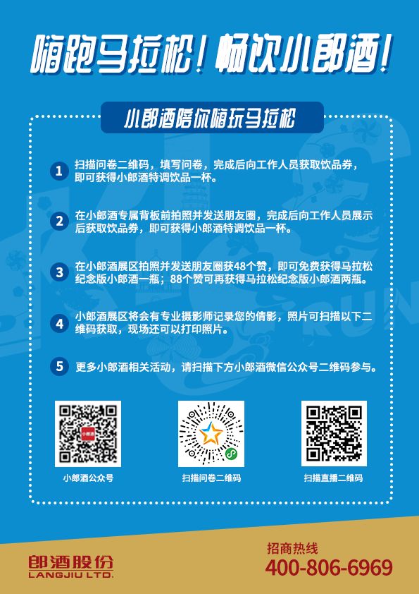 一、嗨跑马拉松 畅饮小郎酒小郎酒福利送上!为了给每一位参赛选手加油助威,小郎酒在马拉松在现场设置了助力奔跑的“小郎酒加油站”和庆祝胜利的“小郎酒庆功bar”,为每位参赛选手赠送长安国际女子半程马拉松纪念版小郎酒,现场还有小郎酒为本次赛事准备的特调饮品等你畅享!想要在赛场成功get,以下攻略必须收藏保存!