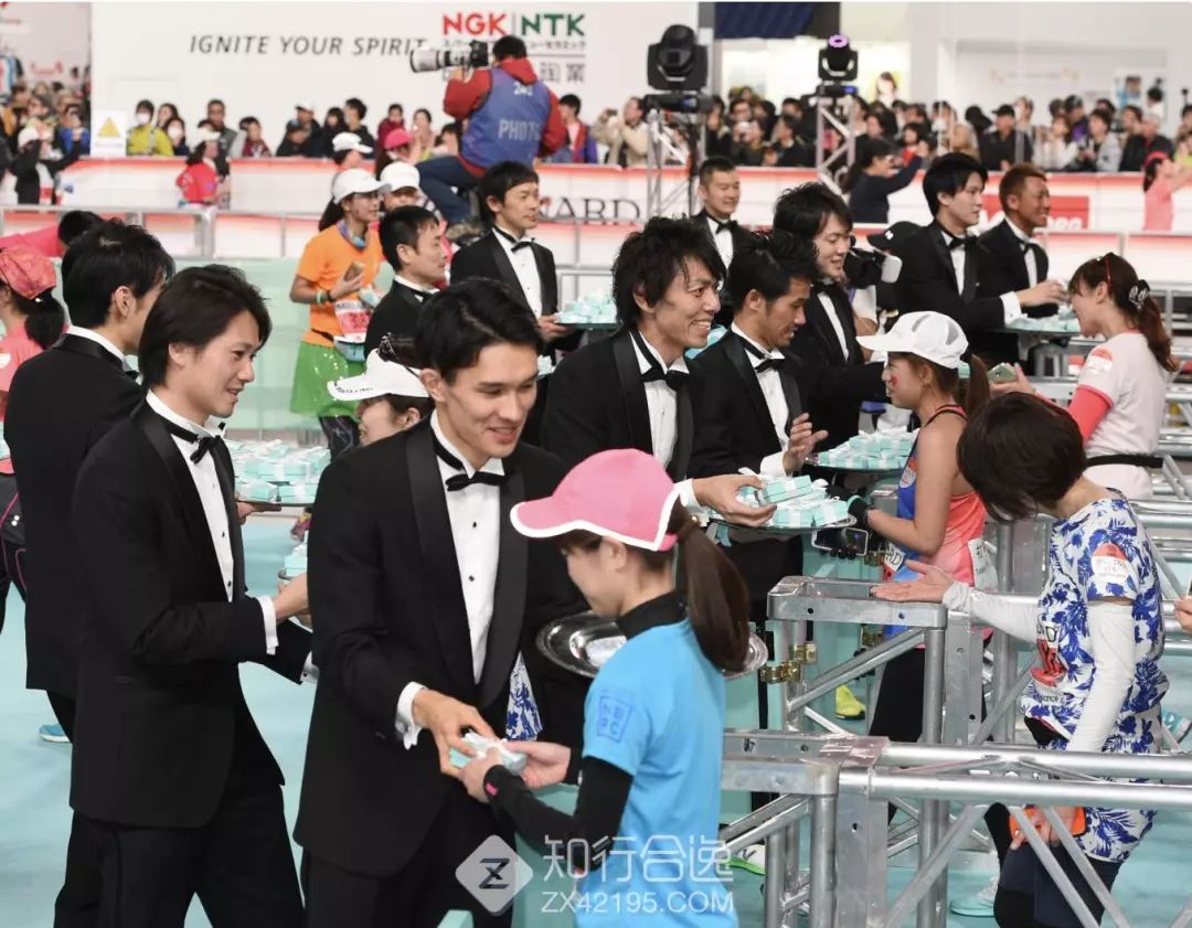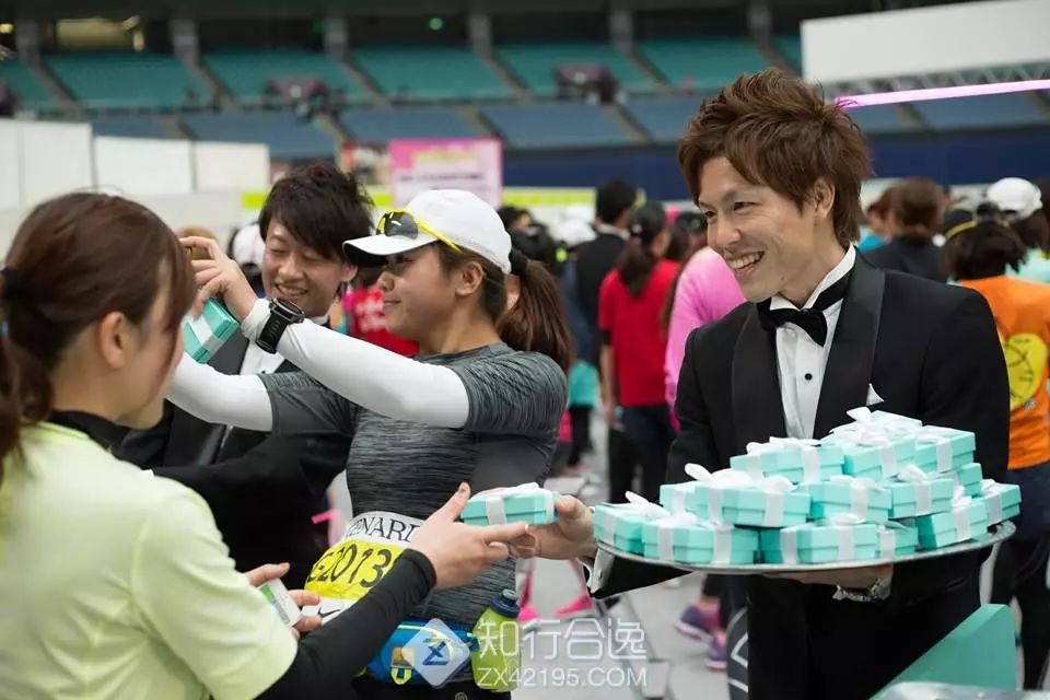 这大概是所有马拉松比赛中最梦幻最美妙的一幕了:冲线拱门后,西装革履的男模双手奉上缀着白色蝴蝶结的蓝色纸盒,他们明眸皓齿,笑盈盈的对你说:“恭喜完赛”!