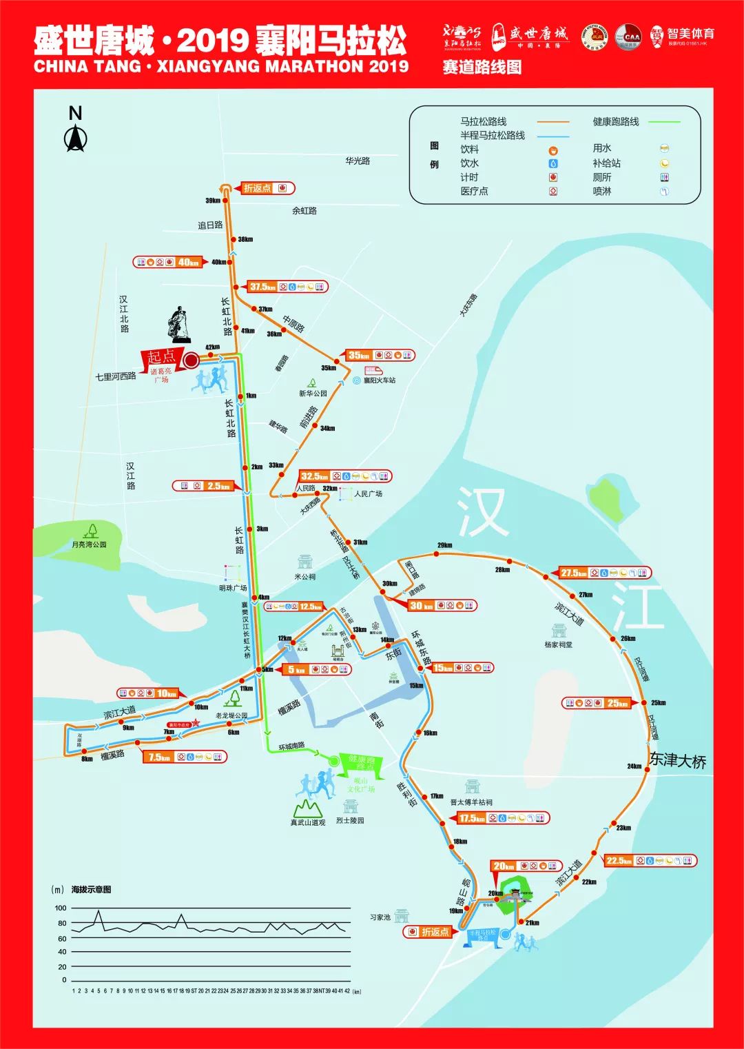 (1)马拉松路线:诸葛亮广场(起点)——长虹路——右转檀溪路——右马拉松:诸葛亮广场(起点)——长虹路——右转檀溪路——右转双湖路——右转至滨江大道——古治街——荆州街——东街——环城东路(阳春门公园)——胜利街(南)——岘山路——穿唐城——唐城东门——左转至滨江大道——闸口路——建锦路——右转上一桥——直行至大庆西路左转人民路——右转前进路——襄阳火车站——中原路(白马广场) ——右转至长虹路(折返点)——诸葛亮广场(终点),总里程为42.195km。